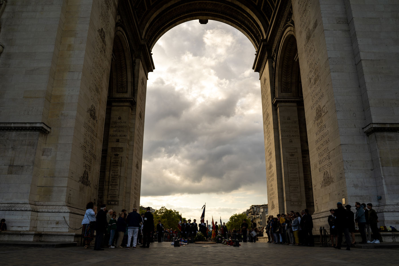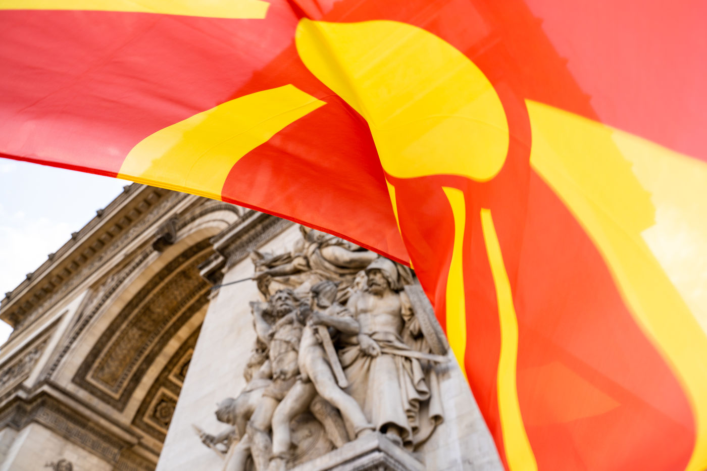 L'Ambassadrice Jadranka Chaushevska Dimov, a ravivé par un geste symbolique, la flamme devant la tombe du Soldat Inconnu sous l'Arc de Triomphe. C'est la première fois que la cérémonie a lieu depuis l'indépendance du pays, à l'occasion de la Fête nationale de la République de Macédoine du Nord, Paris 8 Septembre 2019.