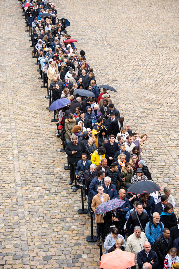 Hommage national populaire pour honorer la mémoire du Président Jacques Chirac. À cette occasion, le cercueil du Président Jacques Chirac a été installé à l'entrée de la cathédrale Saint Louis des Invalides et des registres de condoléances ont été placées à la disposition du public, Paris 29 septembre 2019.