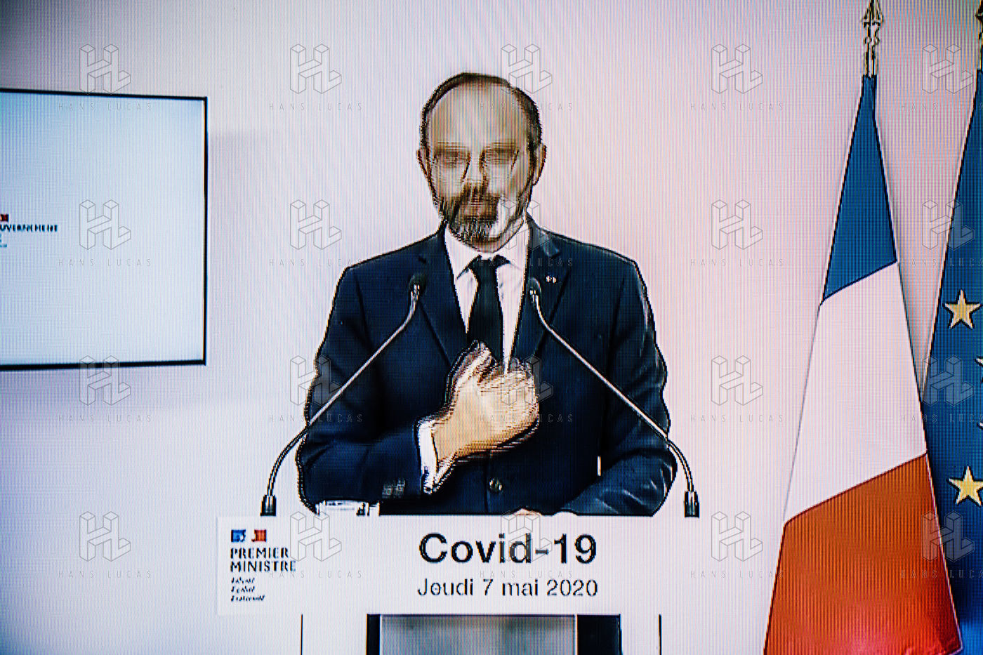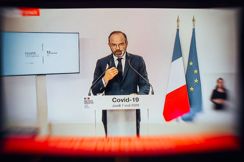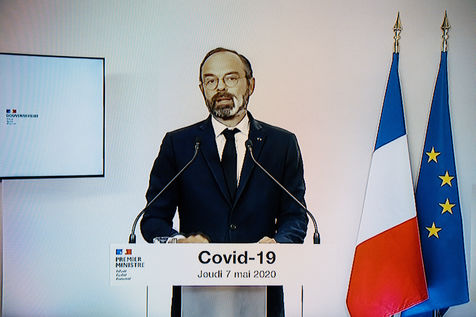 Prime Minister Edouard Philippe, surrounded by six ministers, unveiled France's deconfinement plan, which will begin on Monday 11 May, Paris 07 May 2020.