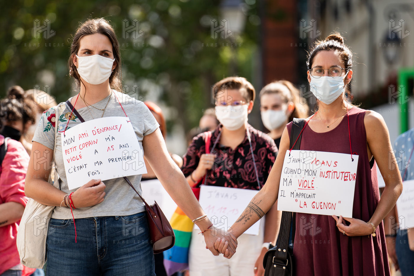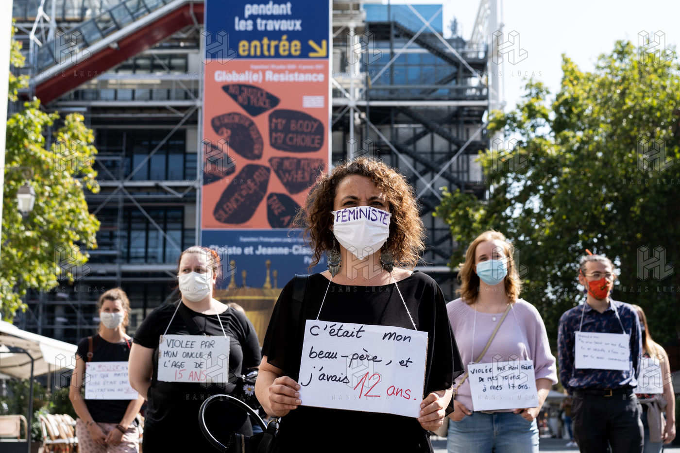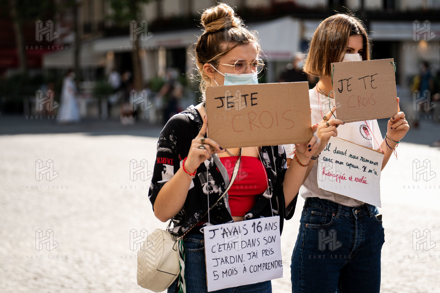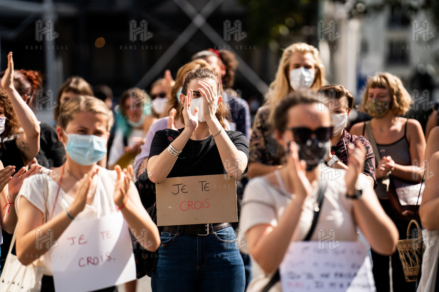 Manifestation "Je te crois" organisée par les Collages Feminicides Paris et Les Resilientes pour permettre aux victimes de témoigner et de libérer leur parole, constamment remise en question, Paris 13 septembre 2020.