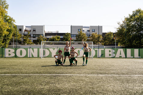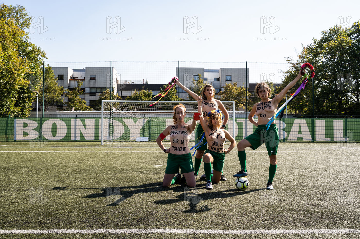 Des militantes FEMEN mènent une action de protestation contre l'exclusion des femmes des activités sportives, sur le terrain de football du stade et centre sportif Léo Lagrange à Bondy, 22 septembre 2020.