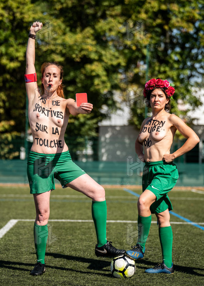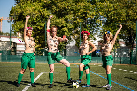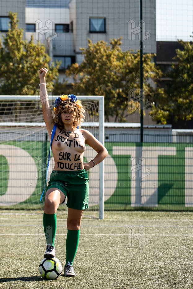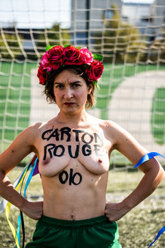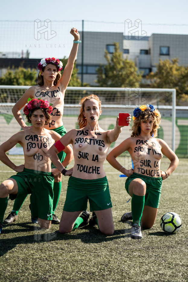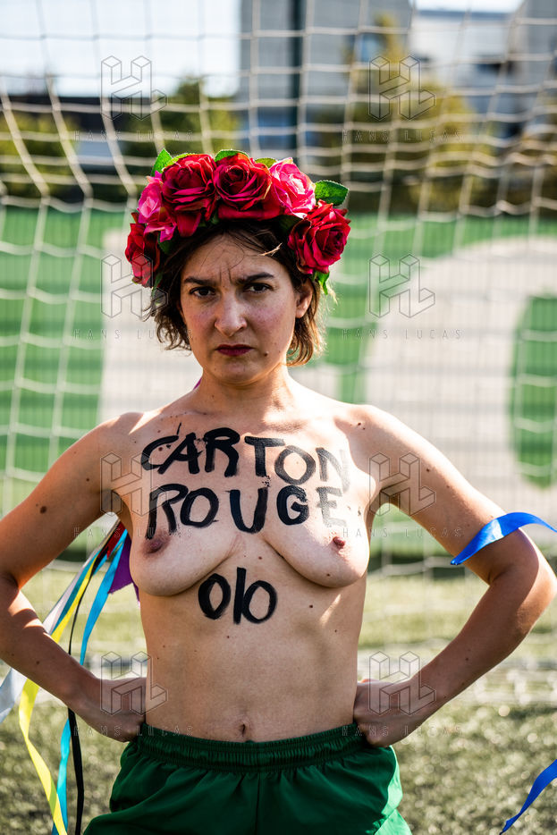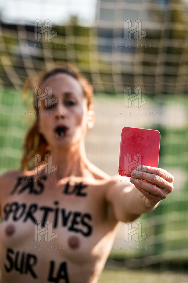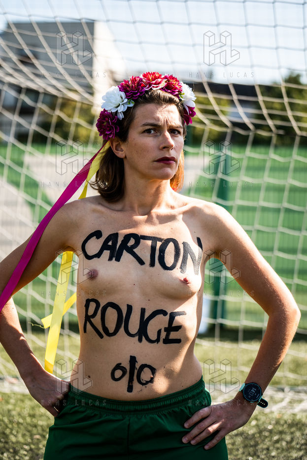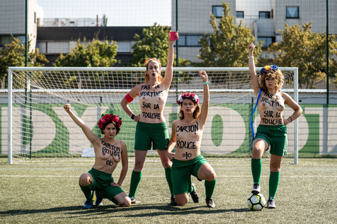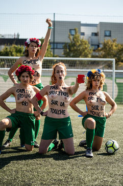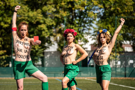 FEMEN activists lead a protest action against the exclusion of women from sports activities, on the soccer field of the Léo Lagrange stadium and sports center in Bondy, September 22, 2020.