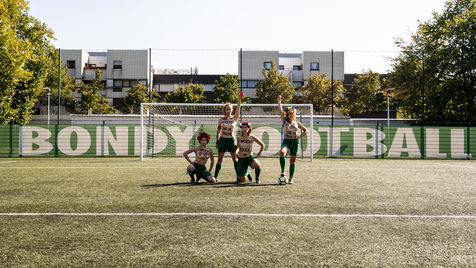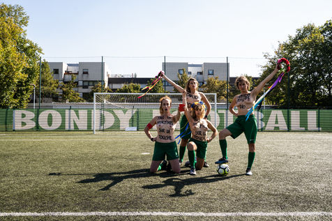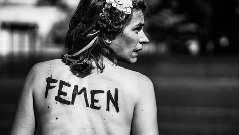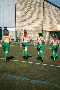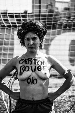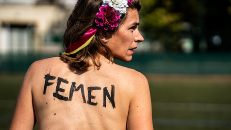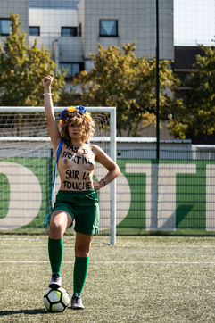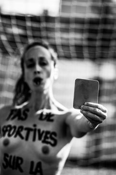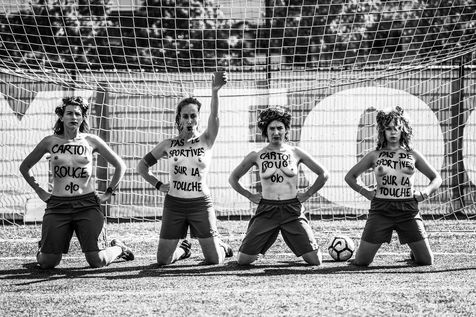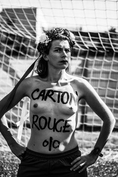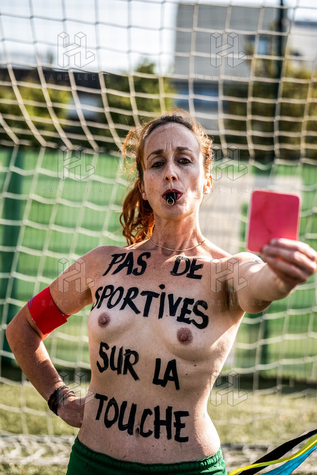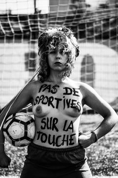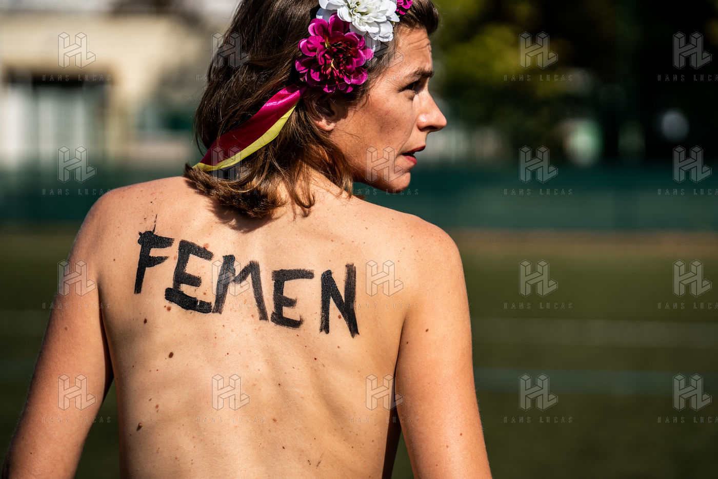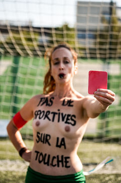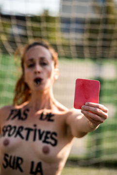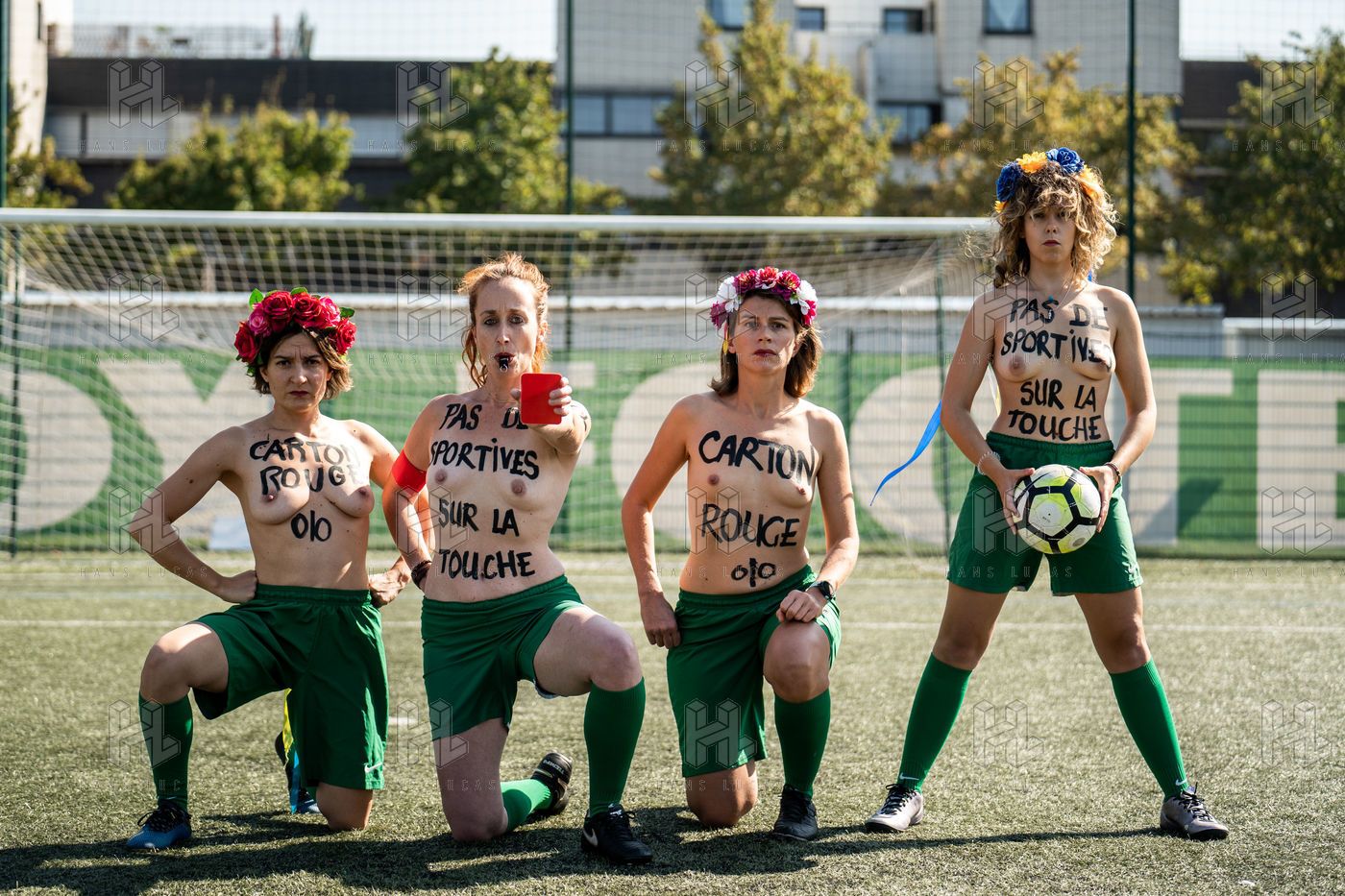 FEMEN activists lead a protest action against the exclusion of women from sports activities, on the soccer field of the Léo Lagrange stadium and sports center in Bondy, September 22, 2020.