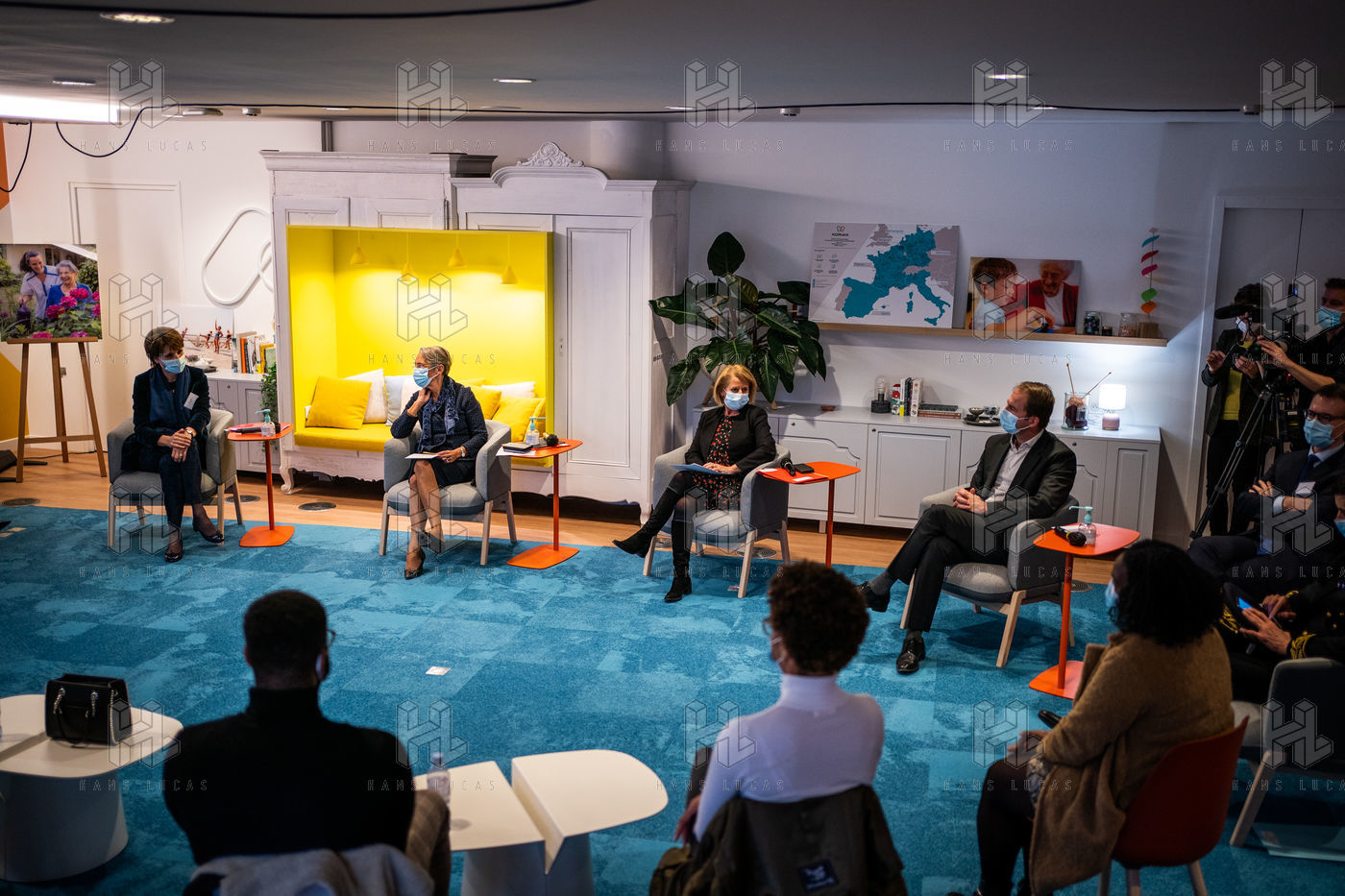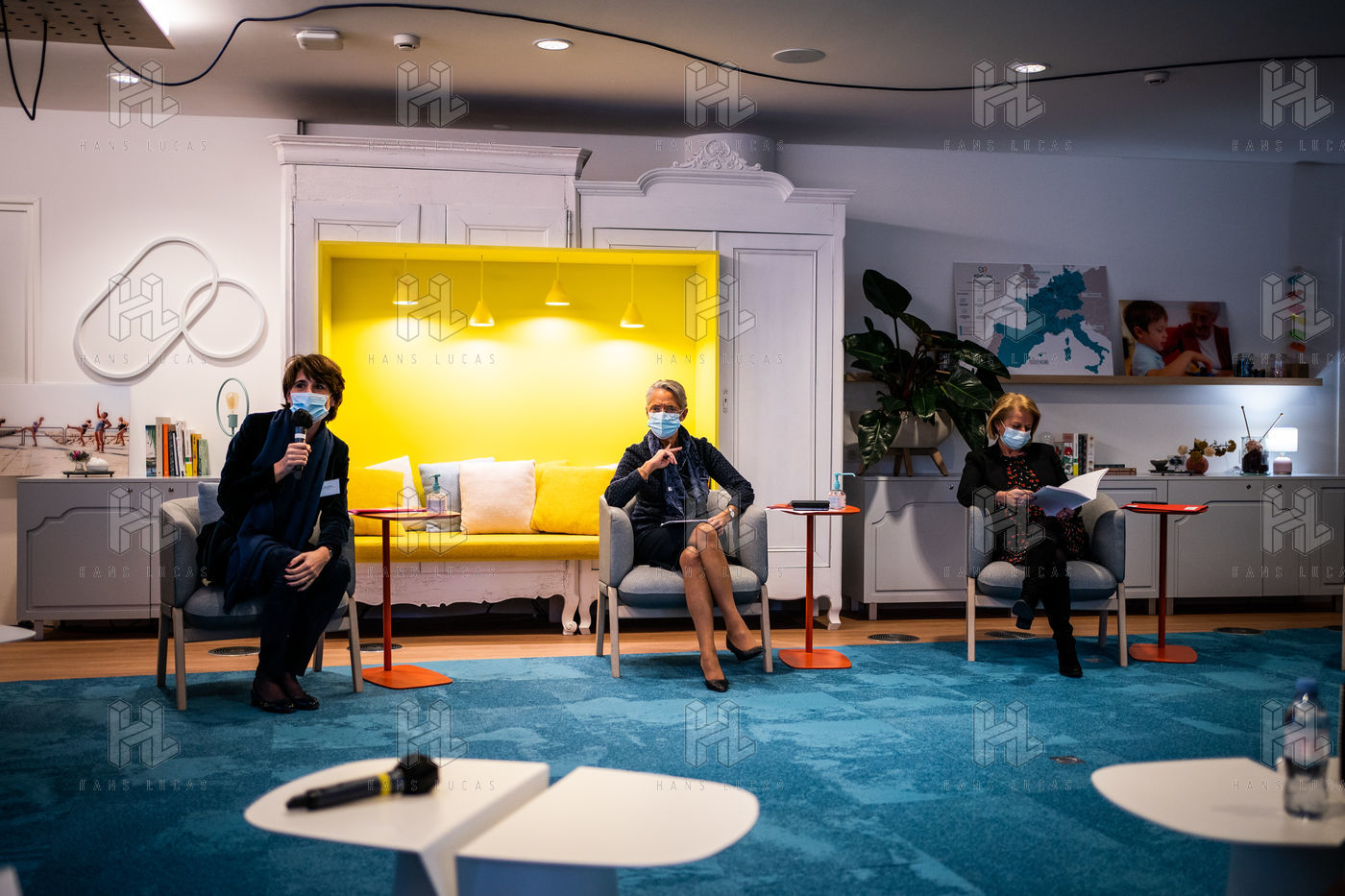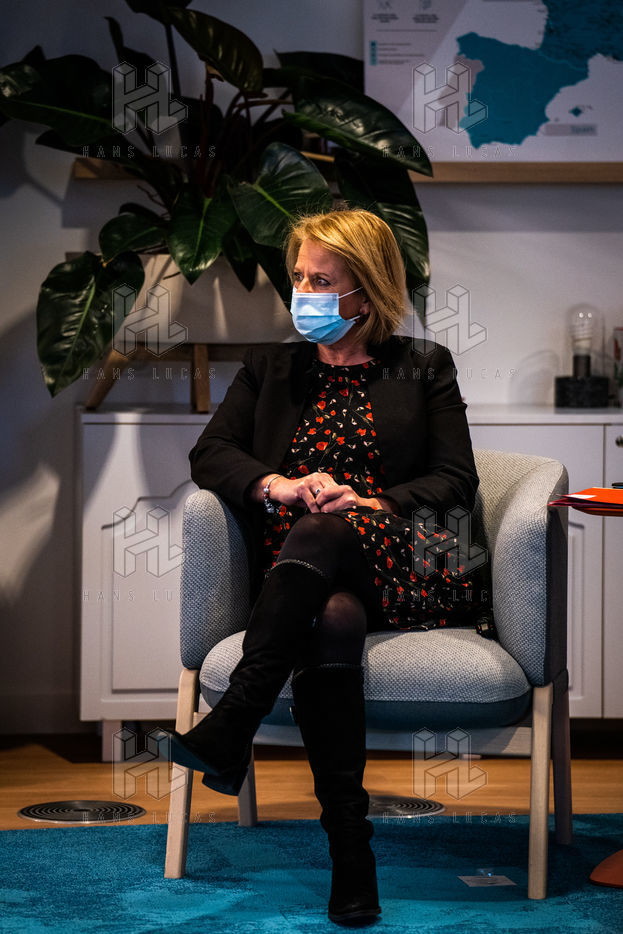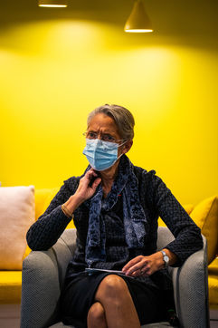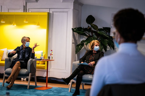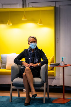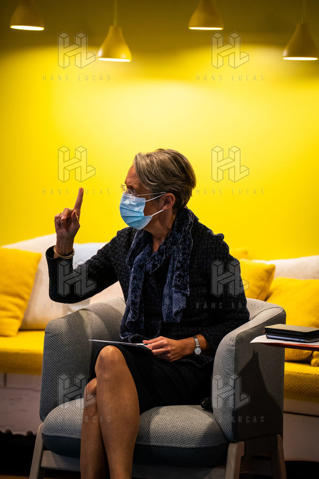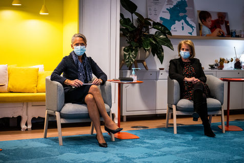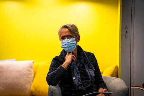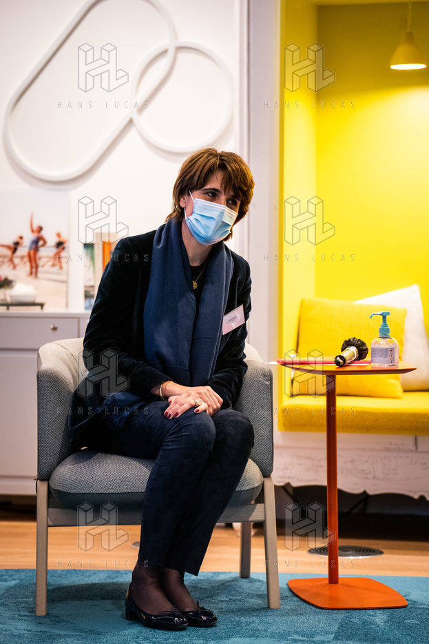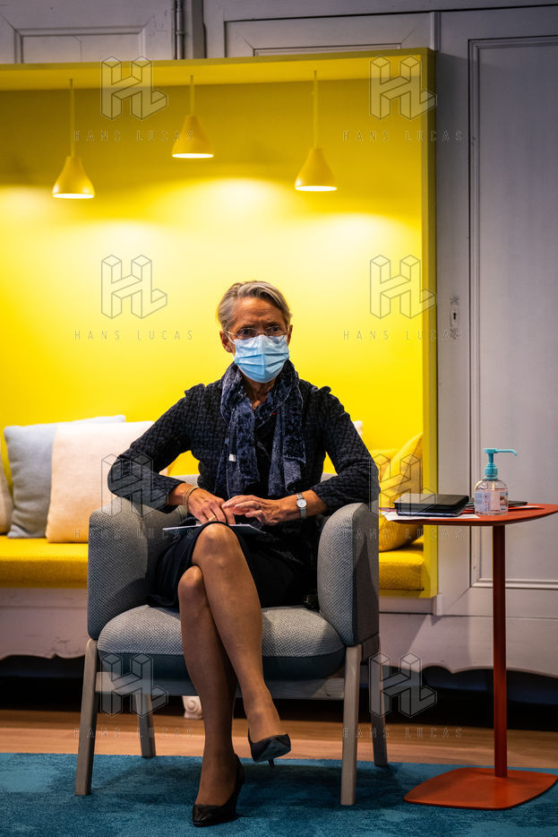 Elisabeth Borne ministre du Travail, de l'Emploi et de l'Insertion, Brigitte Bourguignon ministre déléguée auprès du ministre des Solidarités et de la Santé, chargée de l'Autonomie et Thibaut Guilluy haut-commissaire à l'emploi et à l'engagement des entreprises se rendent chez Korian, groupe européen du soin et de l'accompagnement des personnes âgées et fragiles, pour un entretien sur le thème de l'apprentissage, dispositif clé du plan « 1 jeune, 1 solution » à Paris (8ème arrondissement) Mardi 26 janvier 2021.