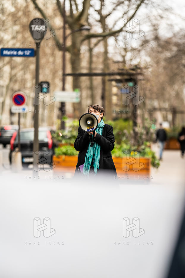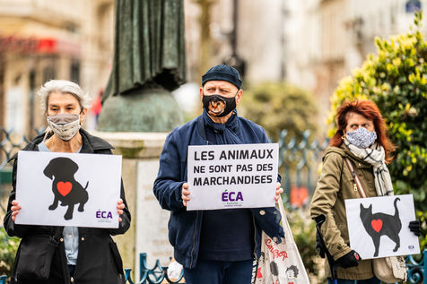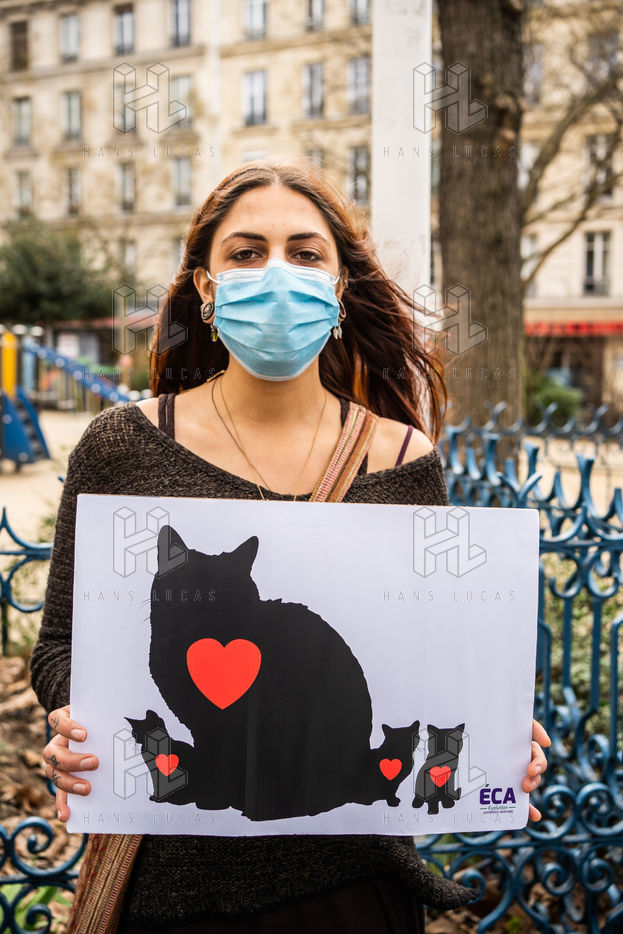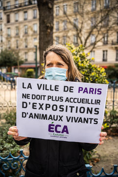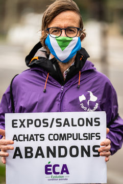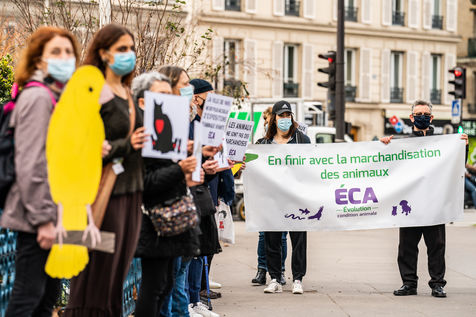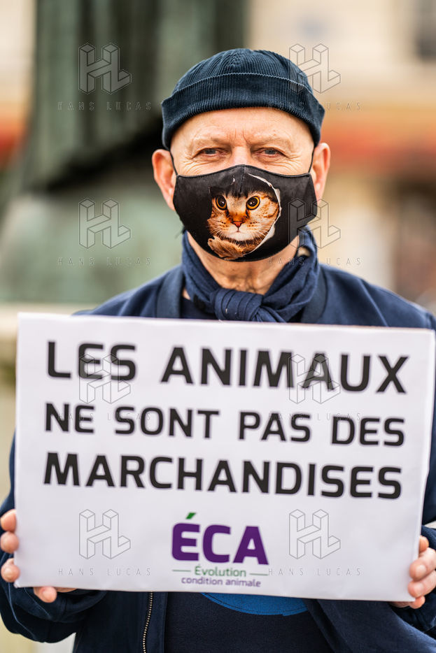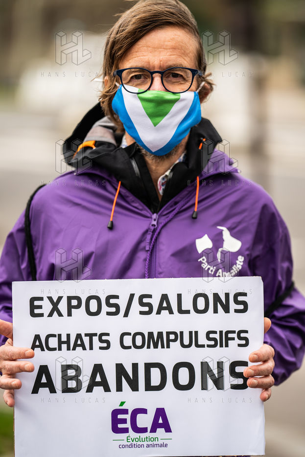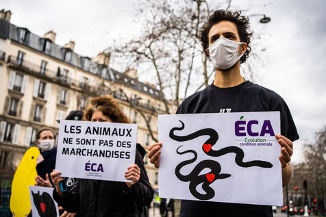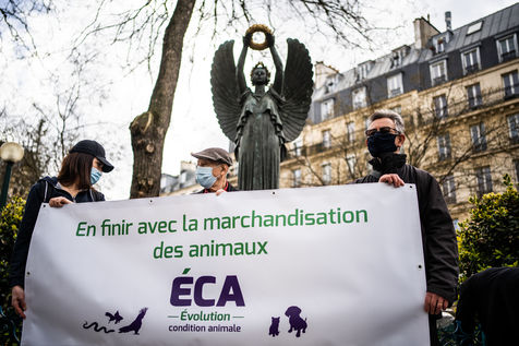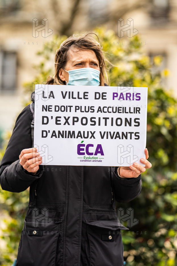 Demonstration against the commodification of animals. Gathering organized by Évolution Condition Animale (ECA) in front of the City Hall of the 12th arrondissement, to demand that the City of Paris no longer host shows and exhibitions sales of live animals on sites it owns or manages, including the Animal Expo show at the Parc Floral, Paris February 23, 2021.