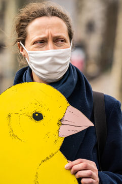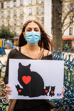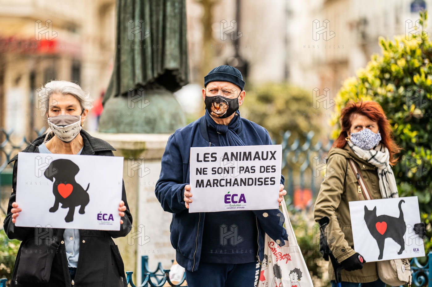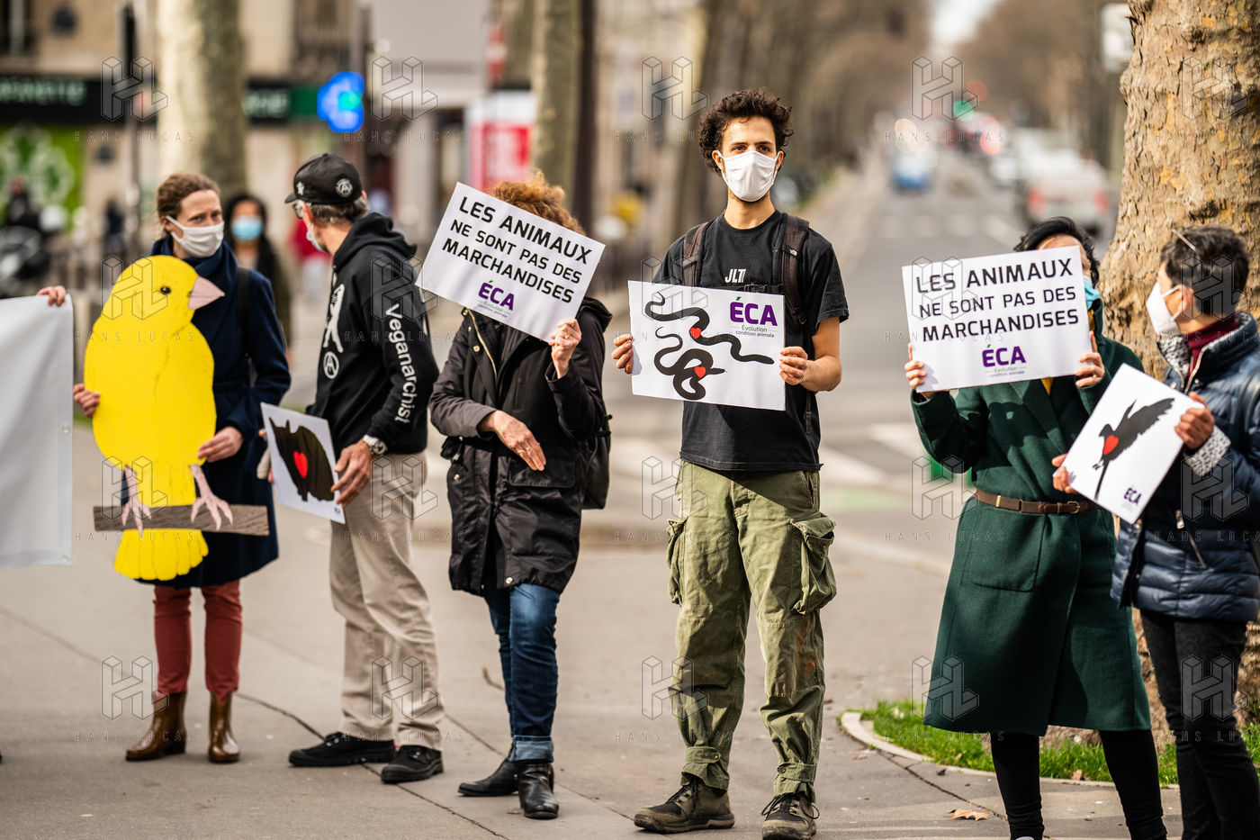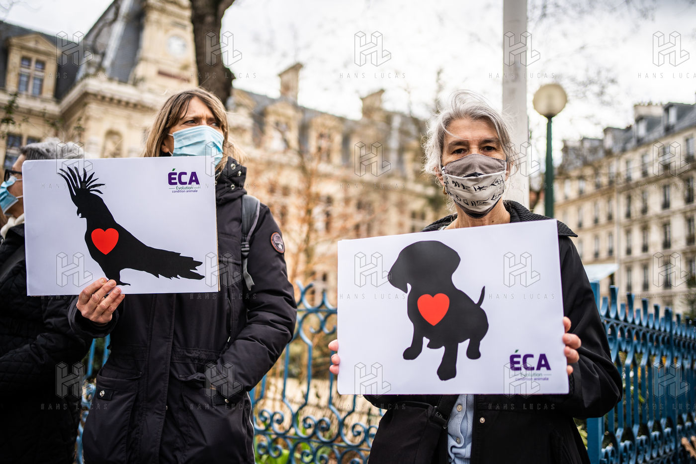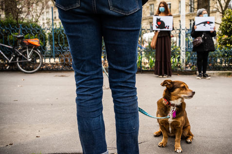 Demonstration against the commodification of animals. Gathering organized by Évolution Condition Animale (ECA) in front of the City Hall of the 12th arrondissement, to demand that the City of Paris no longer host shows and exhibitions sales of live animals on sites it owns or manages, including the Animal Expo show at the Parc Floral, Paris February 23, 2021.