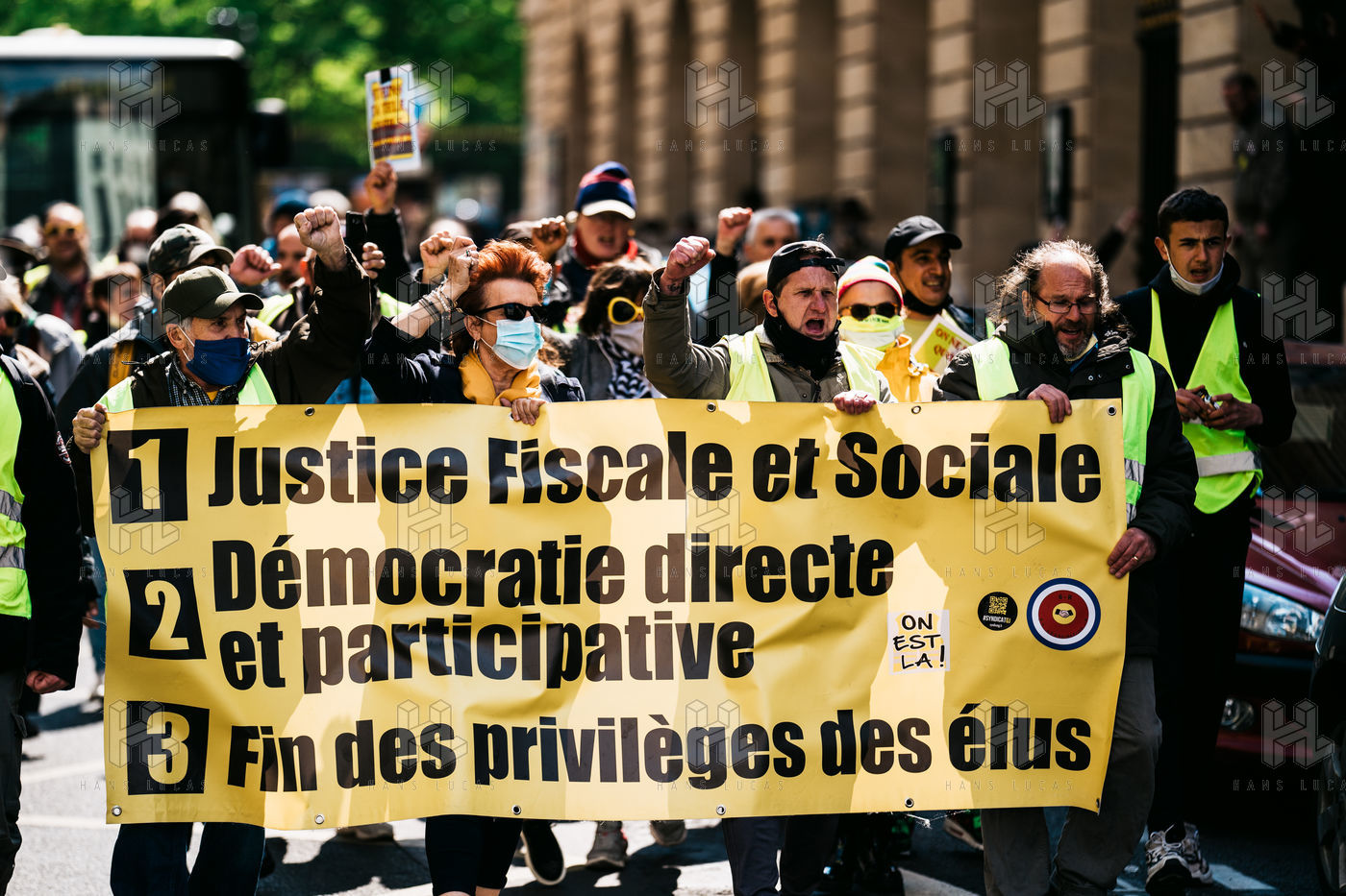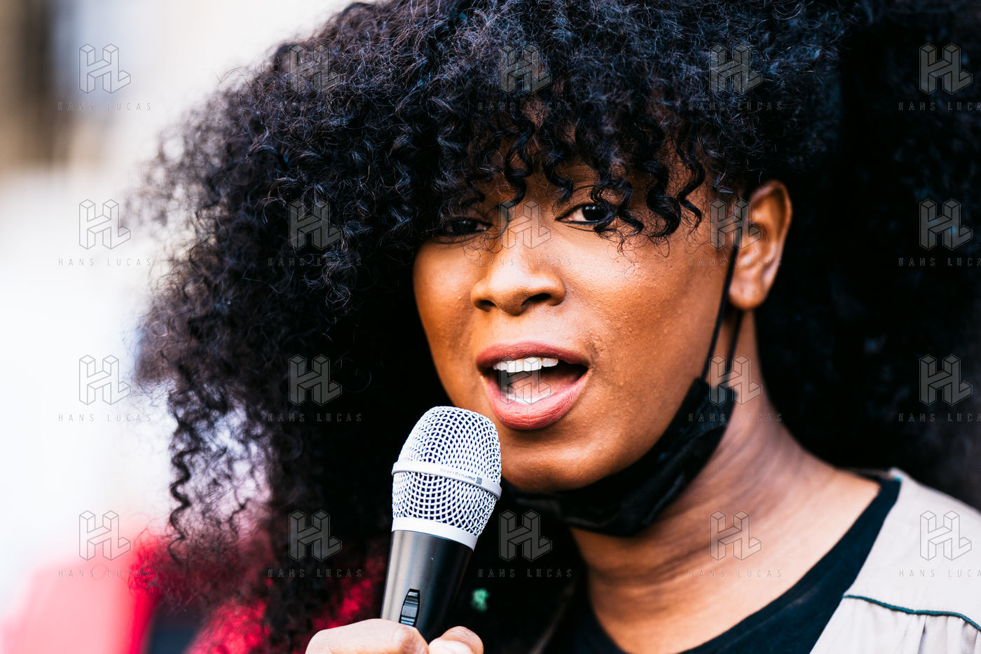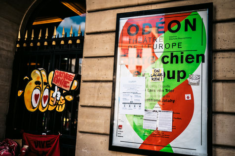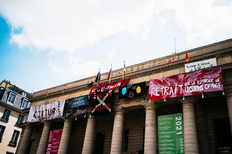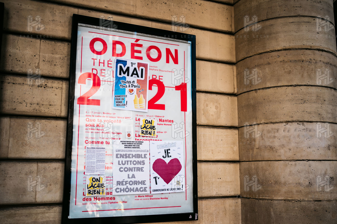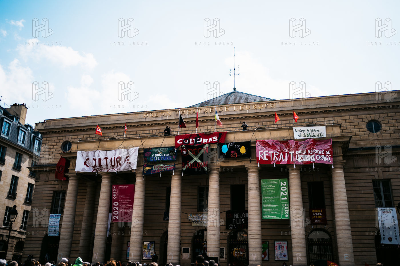Rassemblement et prise de parole en soutien à l'occupation du theatre de l'Odéon, qui se battent pour tous les précaires, à Place de l'Odéon, Paris 17 avril 2021.