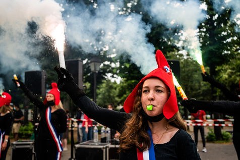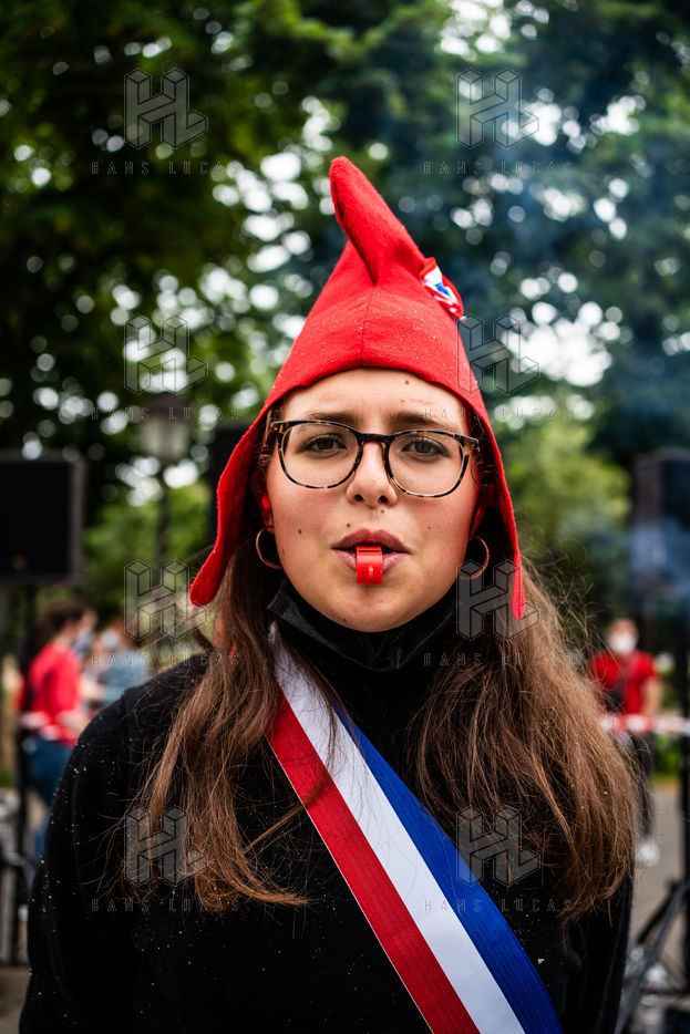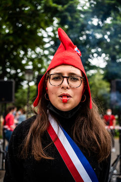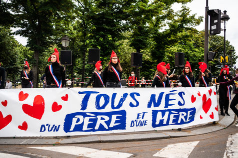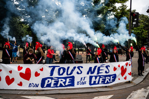 A group of women dressed as Marianne, with smoke bombs, shout slogans against ART (assisted reproductive technology), Paris 29 June 2021.
