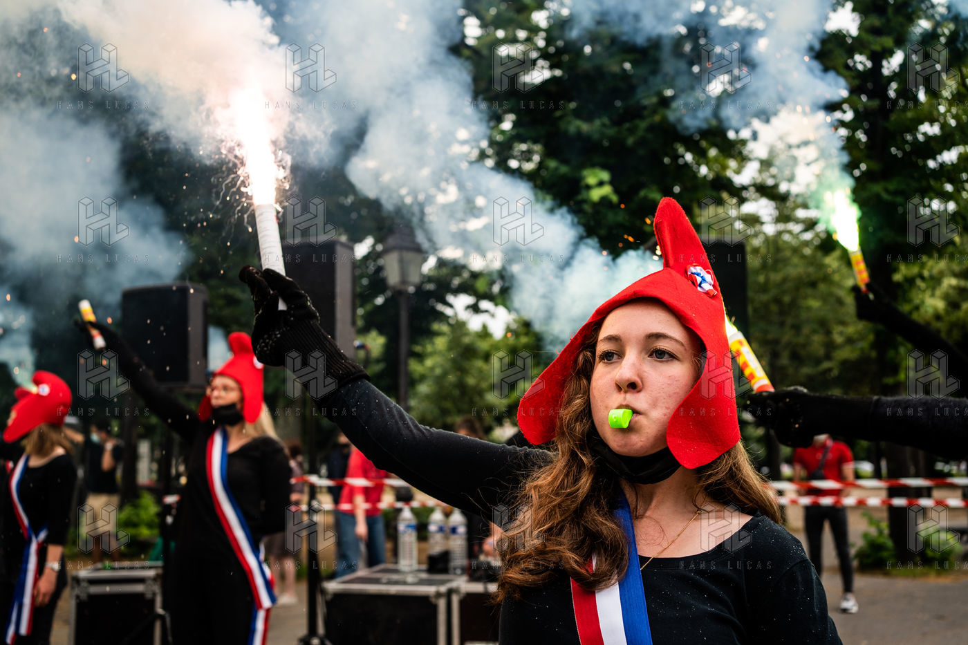 Un groupe de femmes habillées en Marianne, avec des bombes fumigènes, crient des slogans contre la procréation médicalement assistée (PMA), Paris 29 juin 2021.