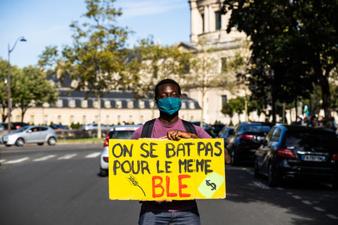 Manifestation, organisée par le collectif pour l'avenir du site de Grignon, des syndicats et des étudiants, contre la vente du domaine de Grignon (Yvelines) au promoteur immobilier Altarea Cogedim, place denys cochin, dans le 7e arrondissement de Paris.
