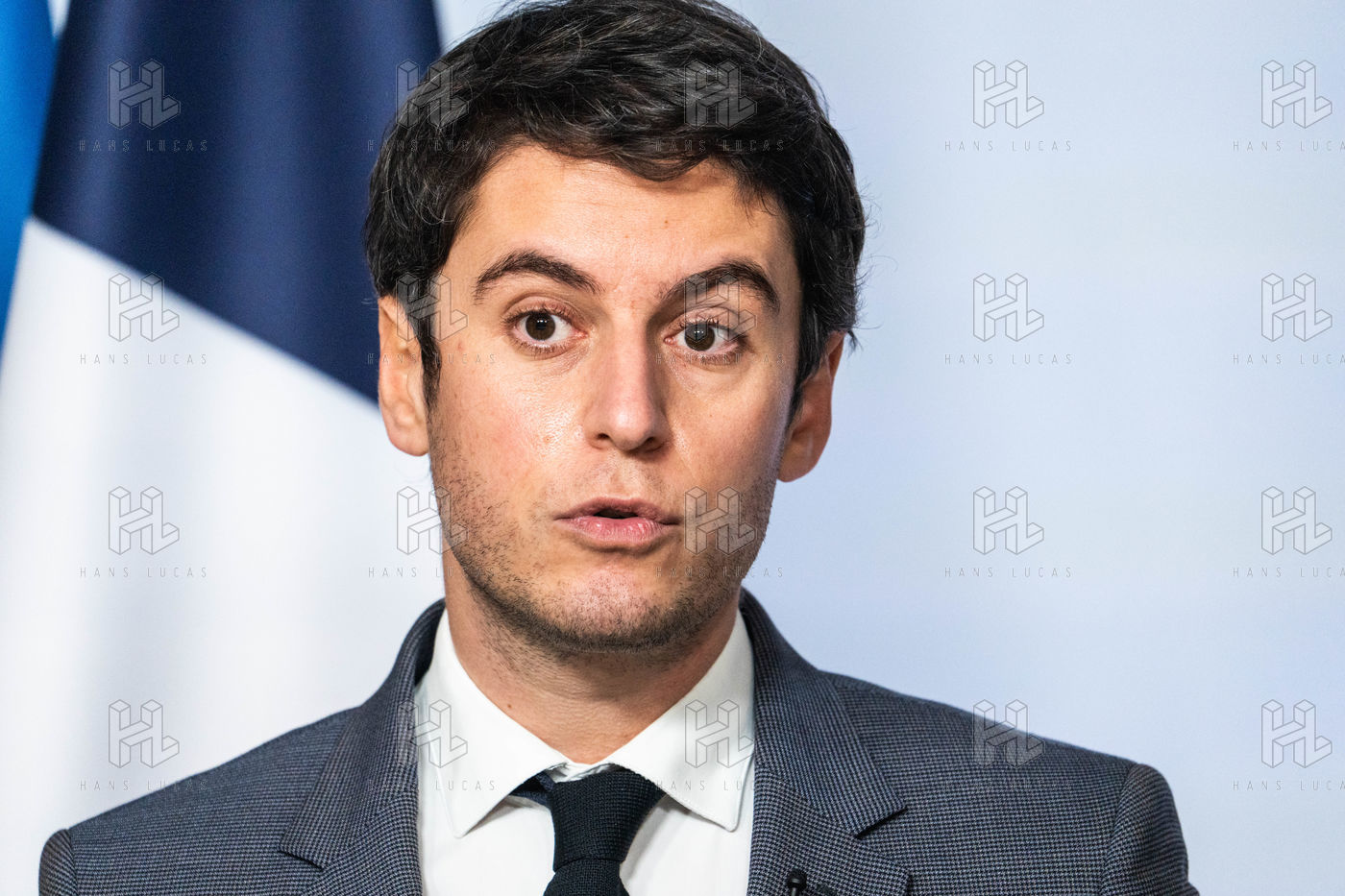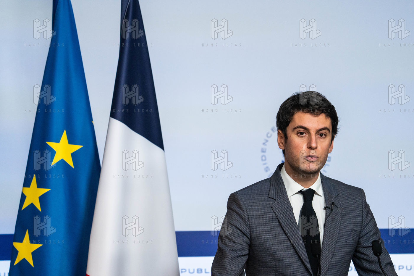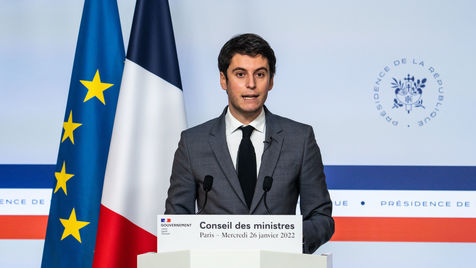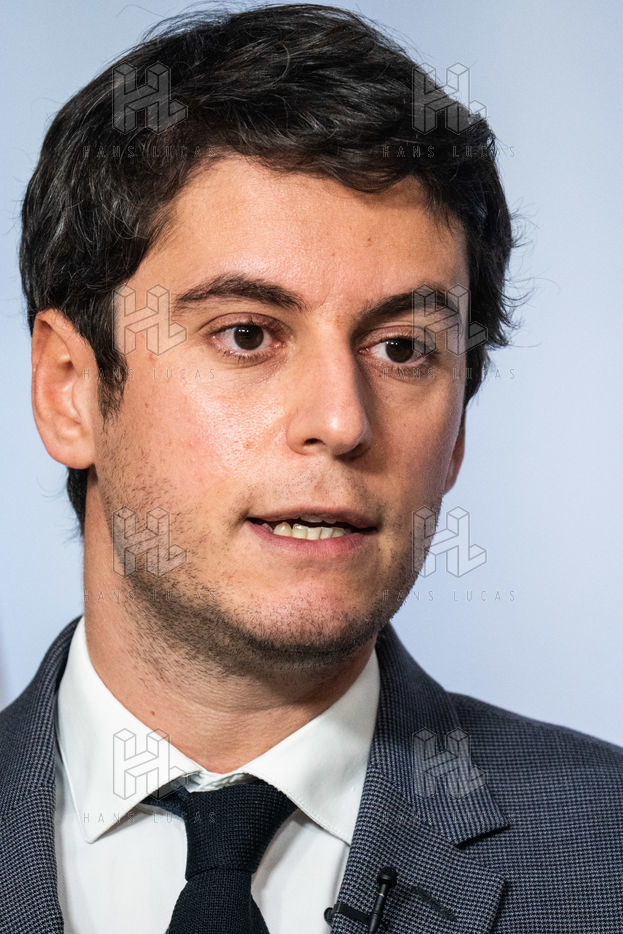 Gabriel Attal, porte-parole du gouvernement, fait un compte-rendu à l'issue du conseil des ministres, dans la salle du porte-parole, Paris 26 JANVIER 2021.