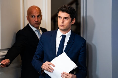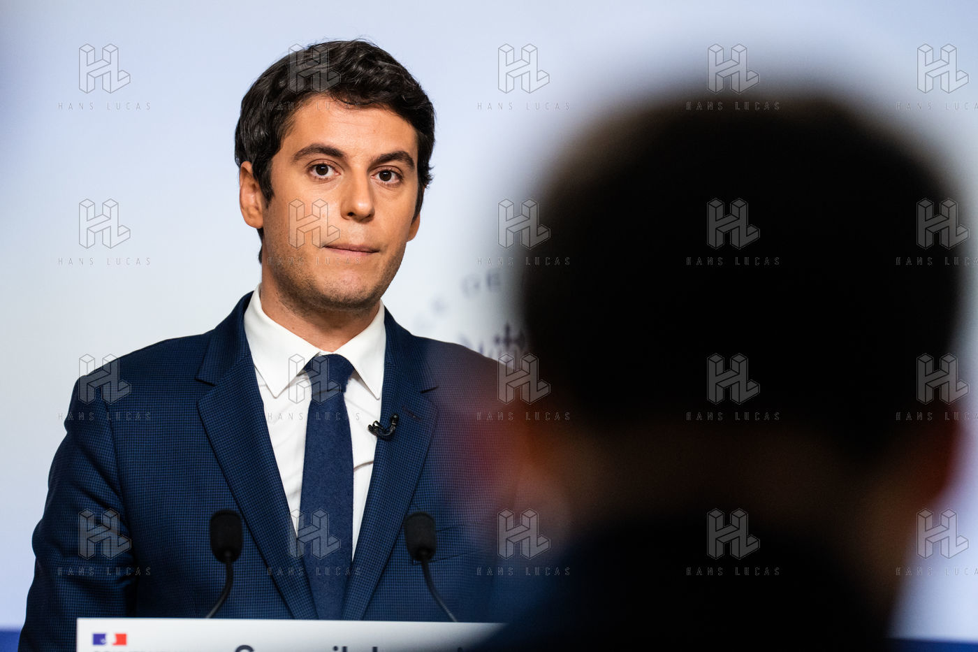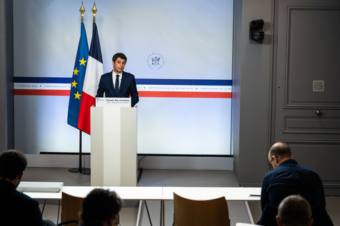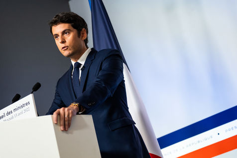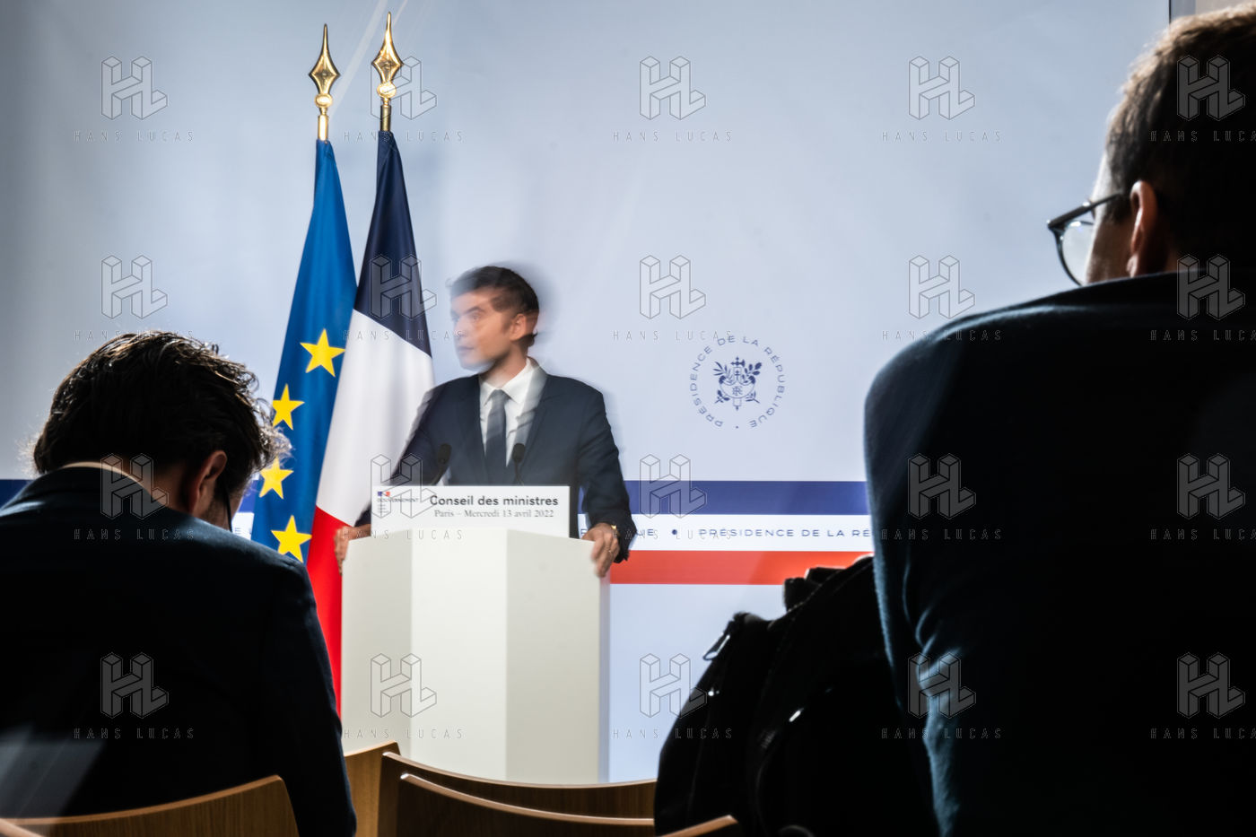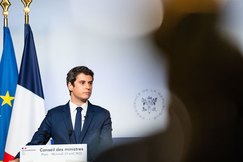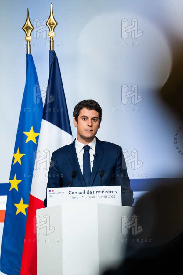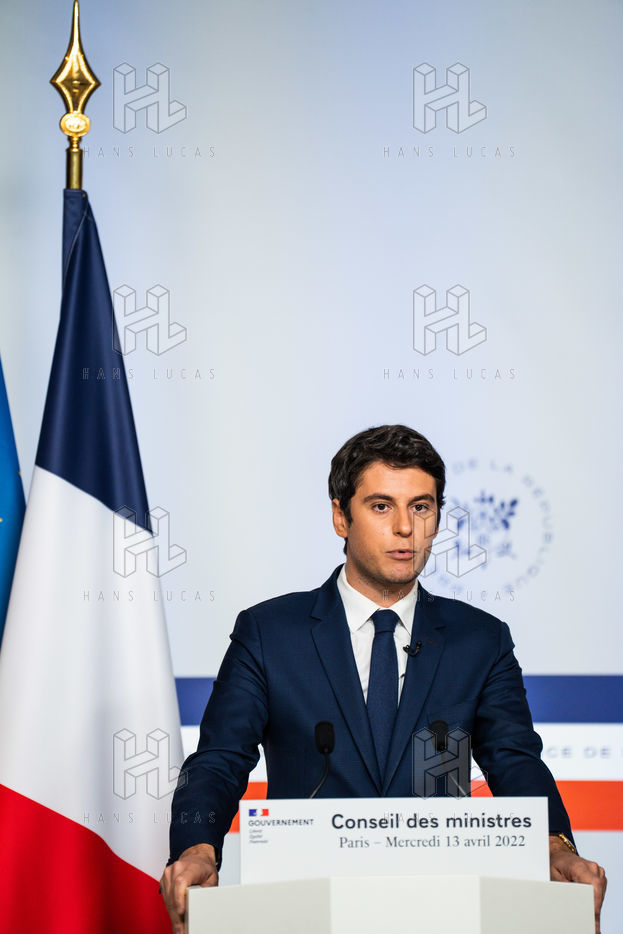 Gabriel Attal, government spokesman, reports after the council of ministers, in the spokesman's room, Paris 13 April 2022.