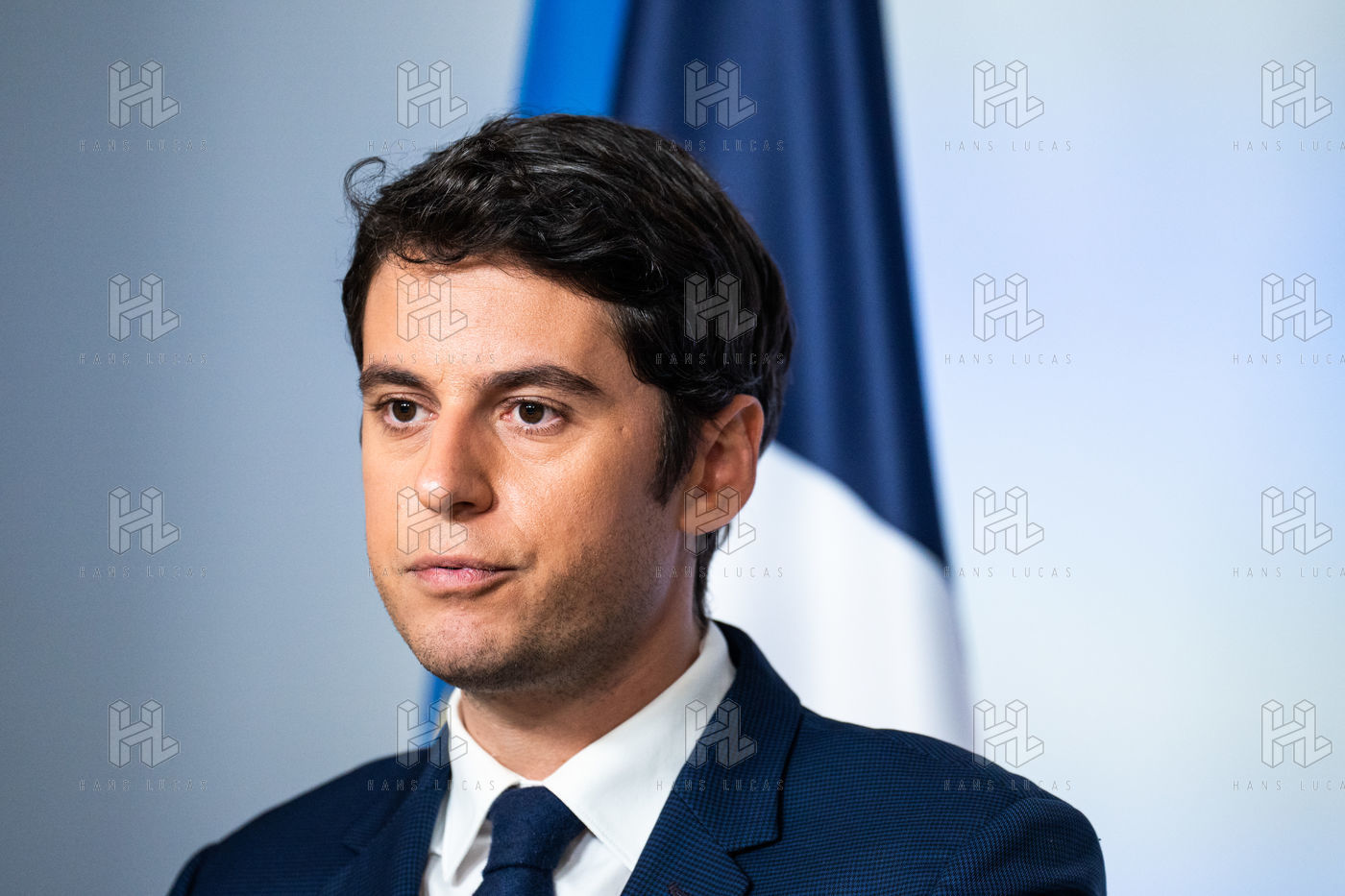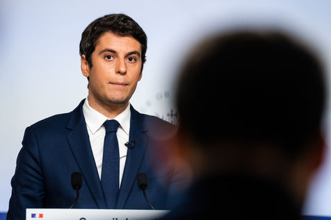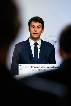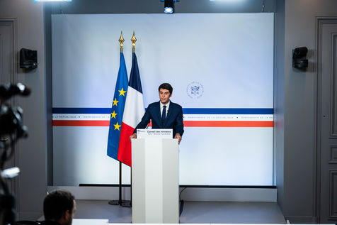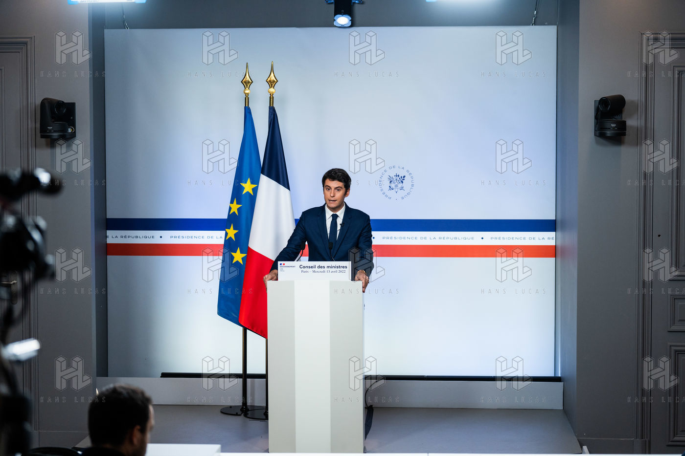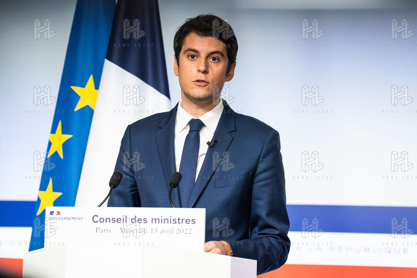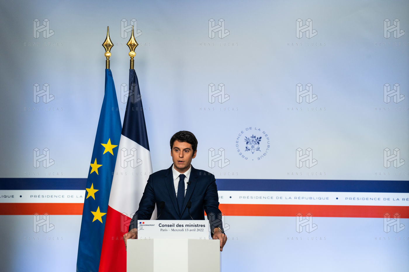 Gabriel Attal, porte-parole du gouvernement, fait un compte-rendu à l'issue du conseil des ministres, dans la salle du porte-parole, Paris 13 avril 2022.