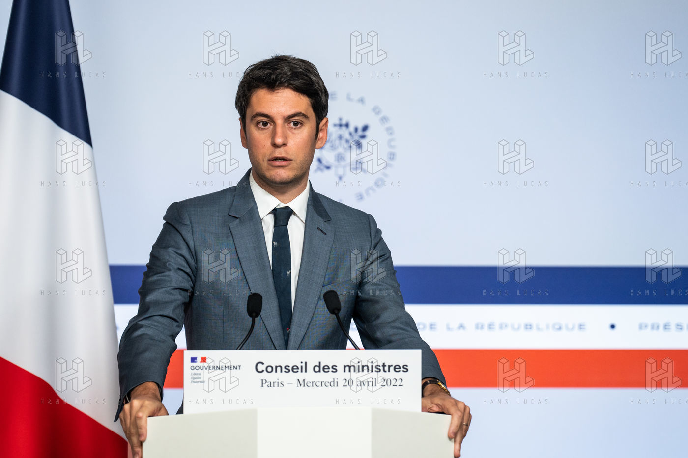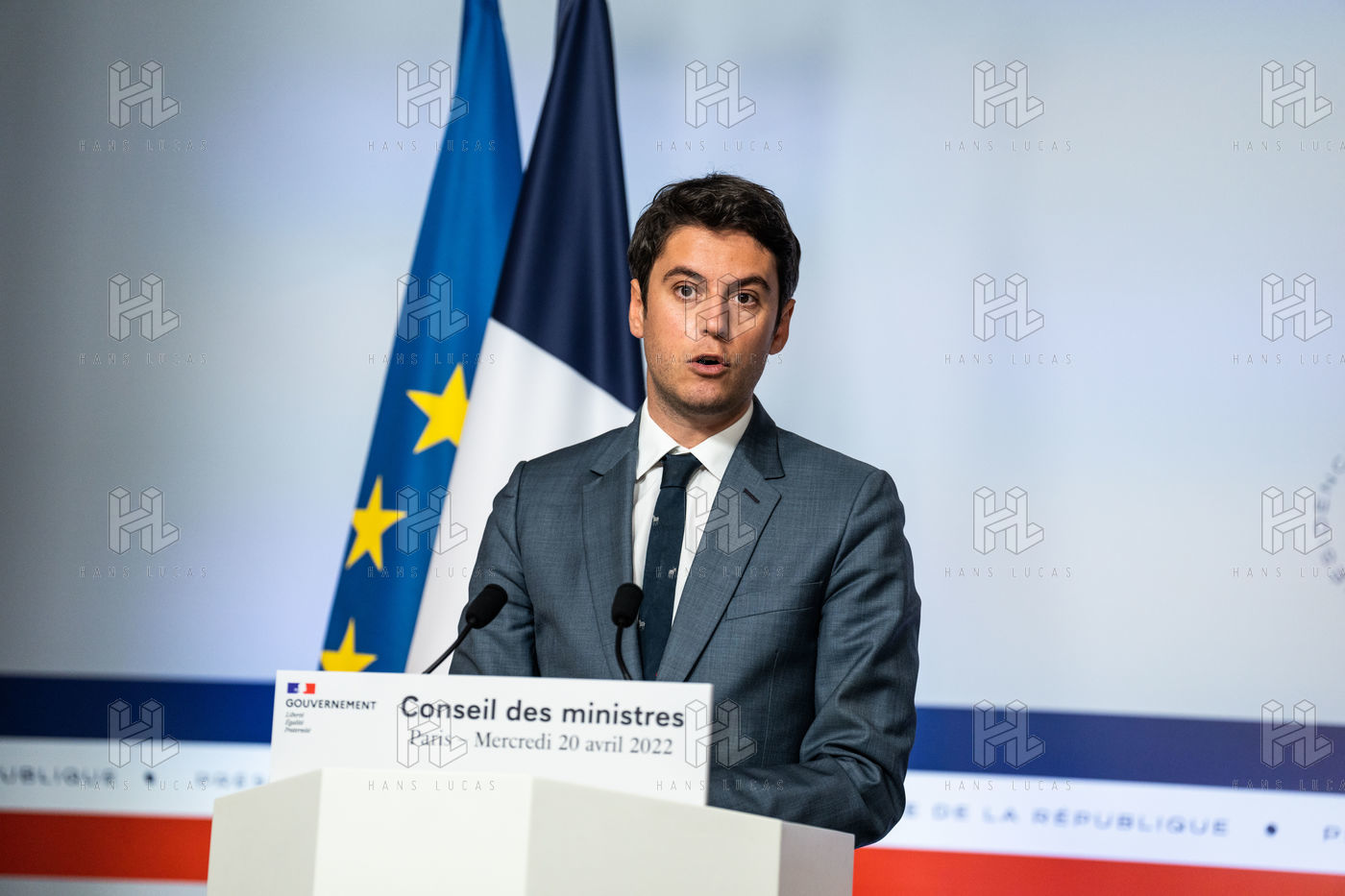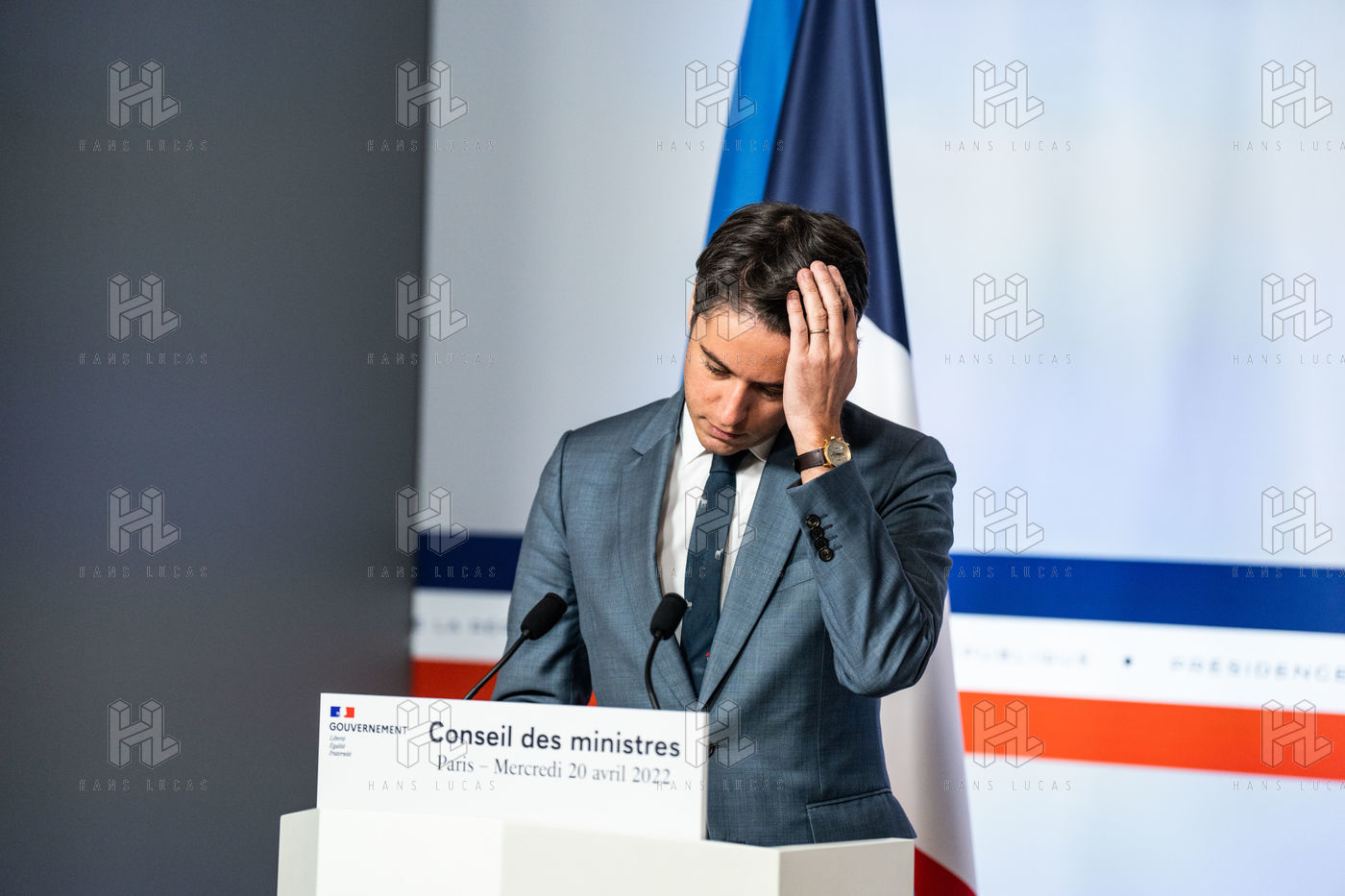 Gabriel Attal, government spokesman, reports after the council of ministers, in the spokesman's room, Paris 20 April 2022.
