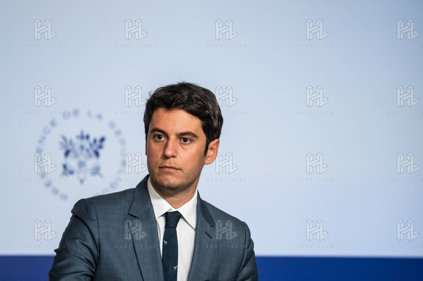 Gabriel Attal, porte-parole du gouvernement, fait un compte-rendu à l'issue du conseil des ministres, dans la salle du porte-parole, Paris 20 avril 2022.