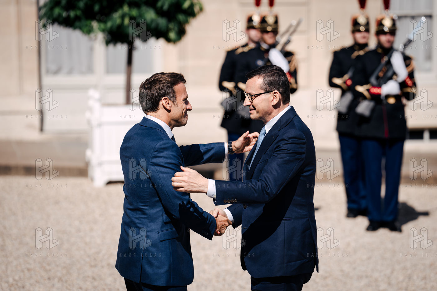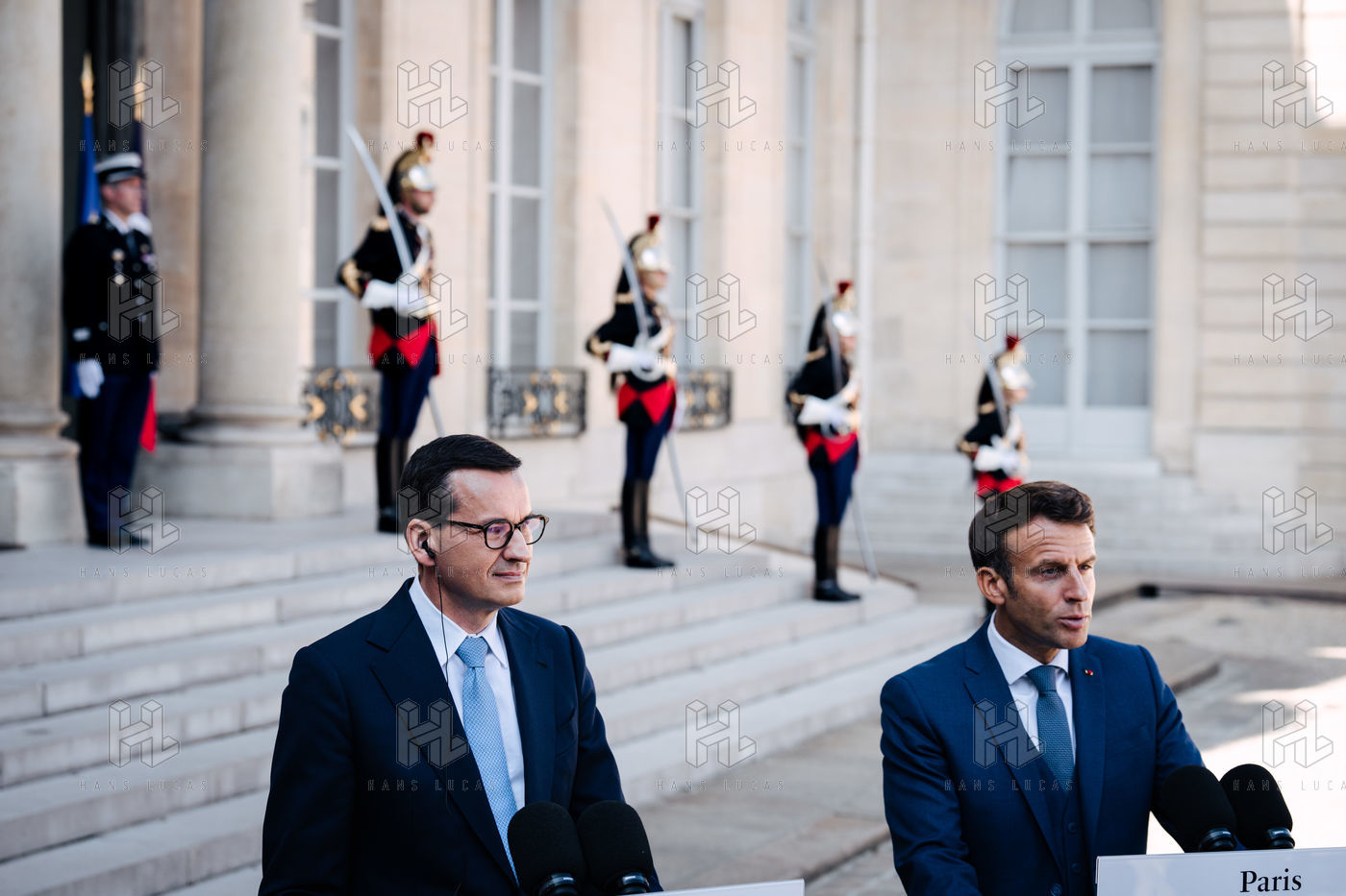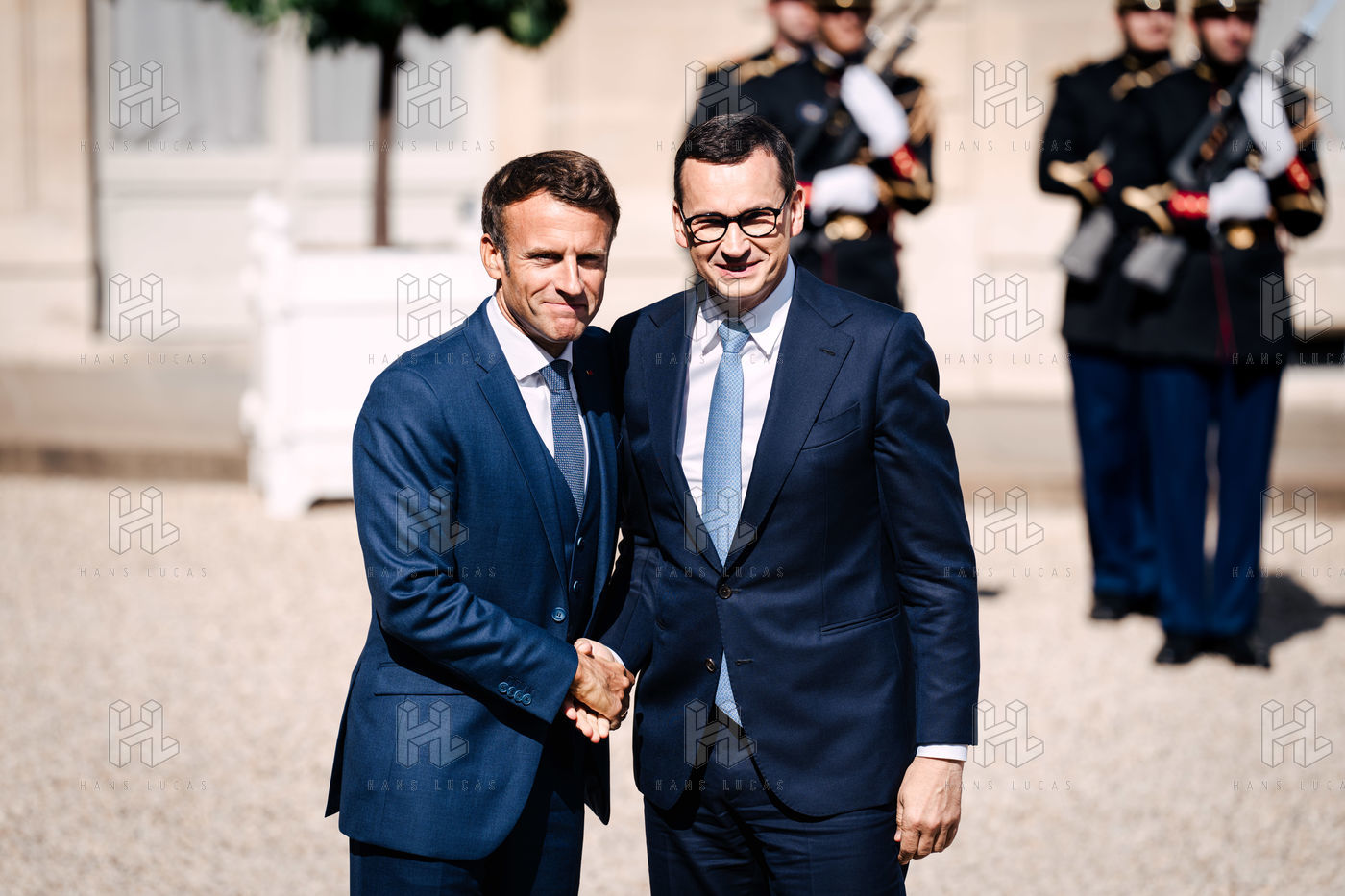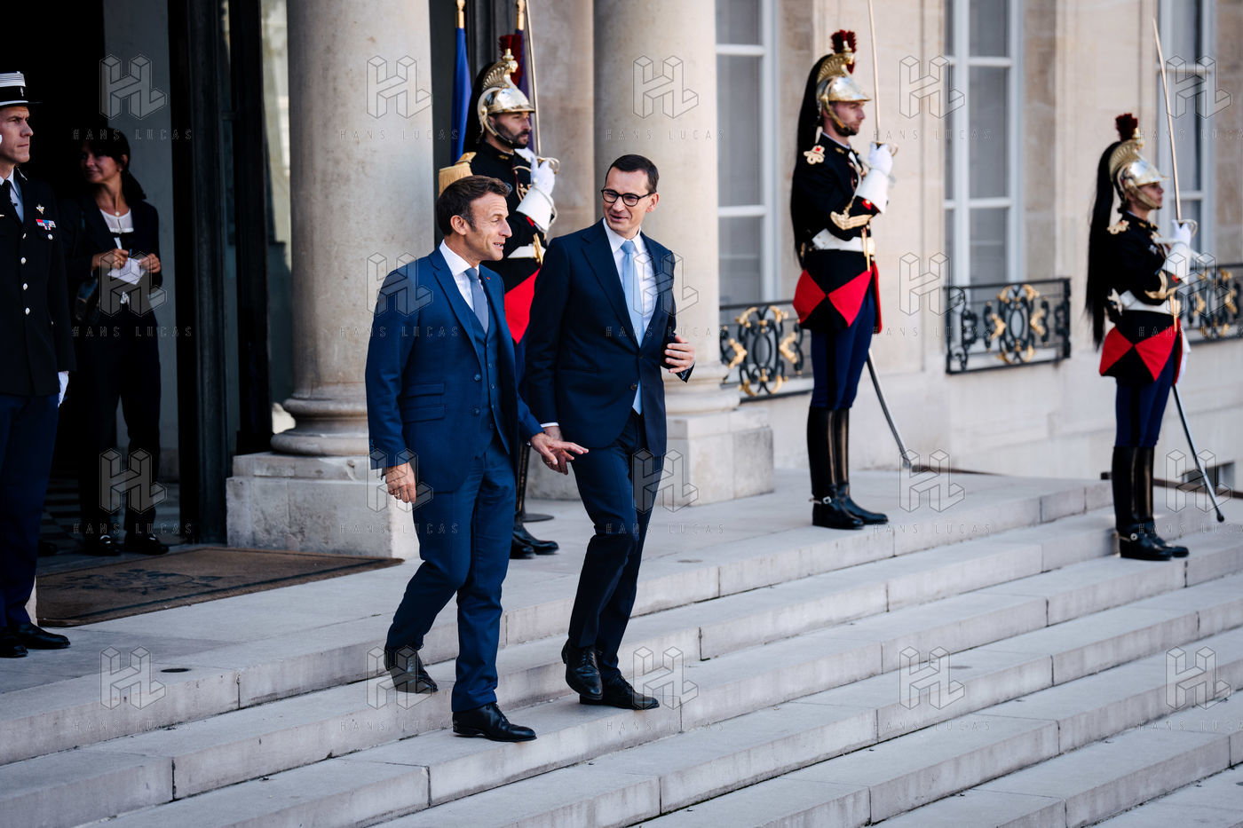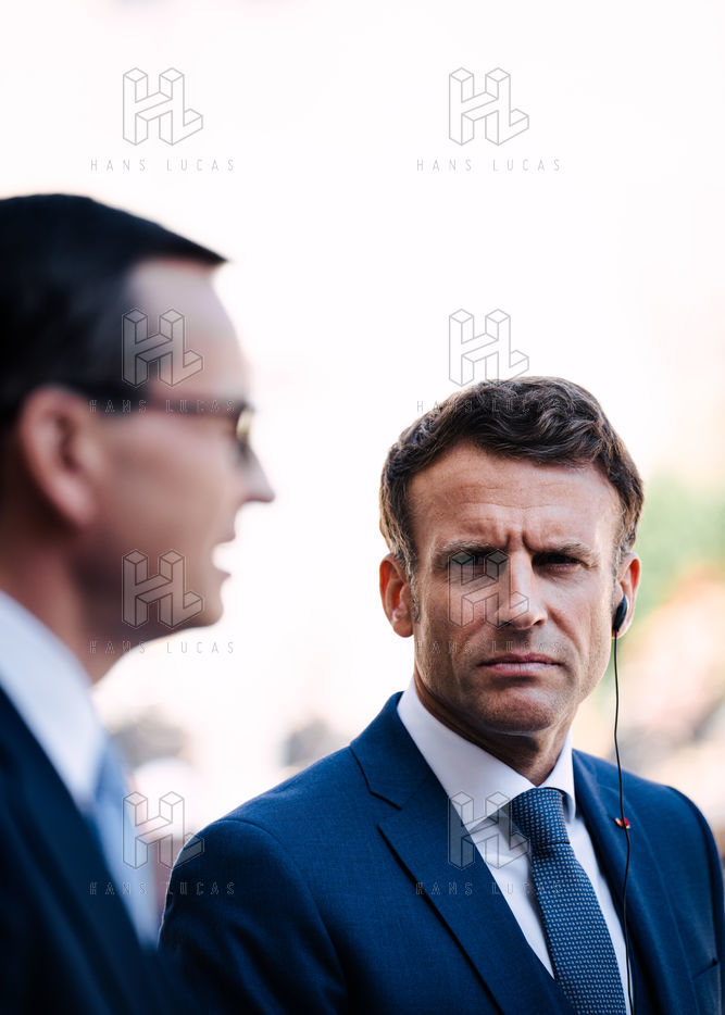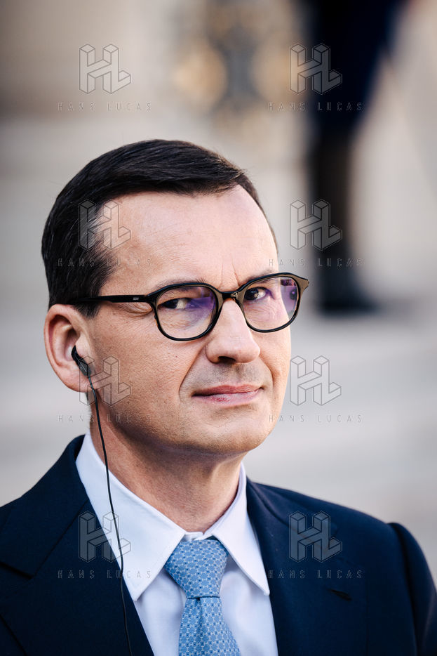 Rencontre entre Mateusz Morawiecki, président du Conseil des ministres de Pologne, et Emmanuel Macron, président de la République française, au palais de l'Élysée.