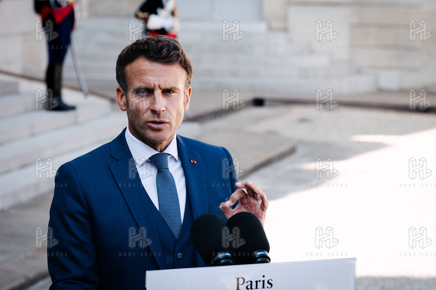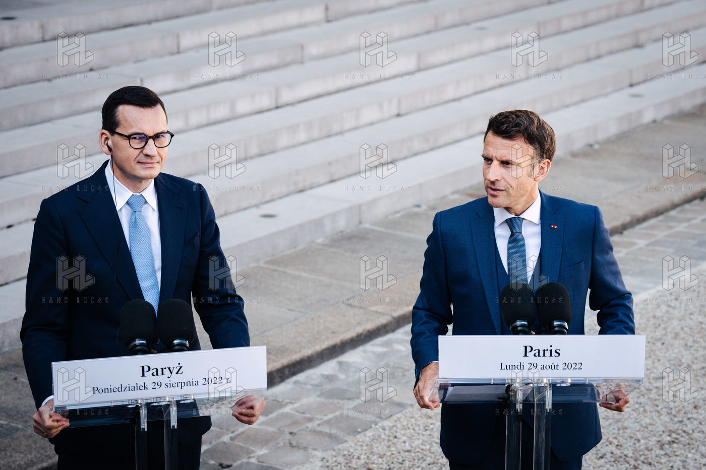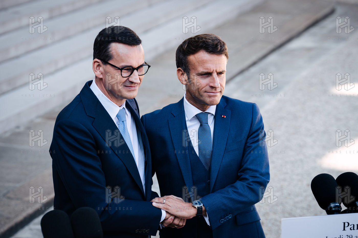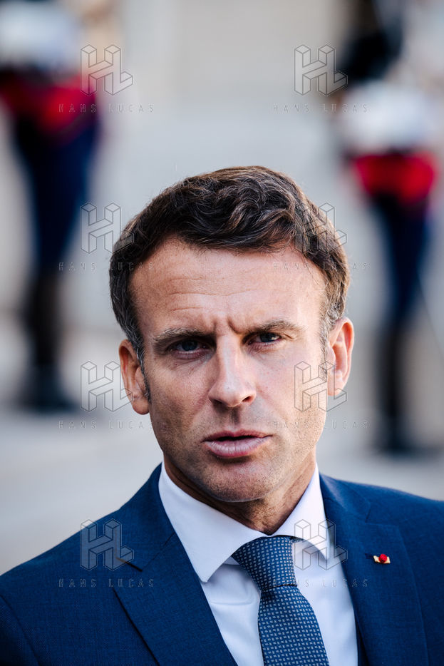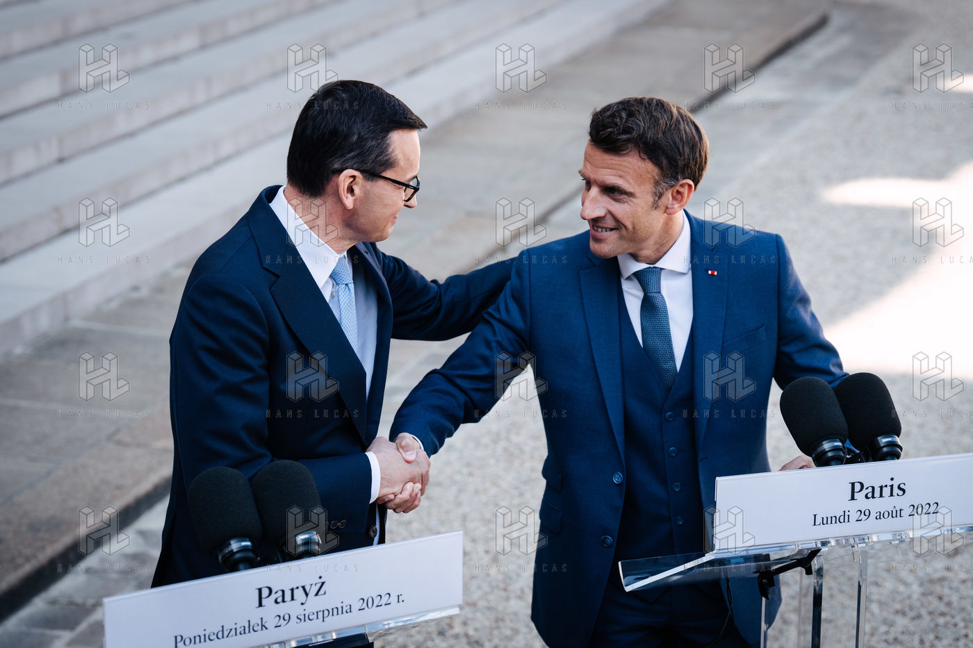 Rencontre entre Mateusz Morawiecki, président du Conseil des ministres de Pologne, et Emmanuel Macron, président de la République française, au palais de l'Élysée.