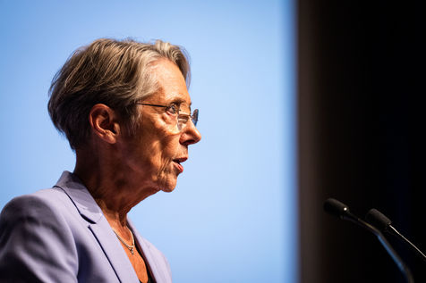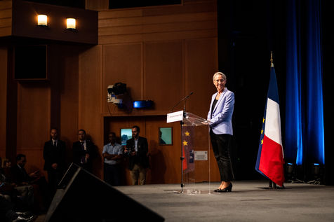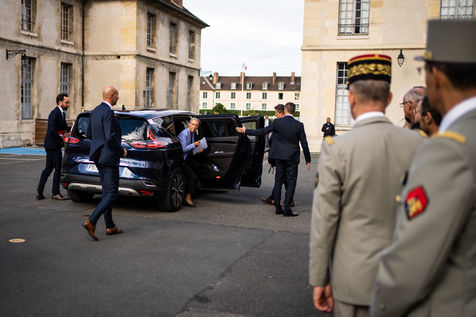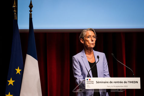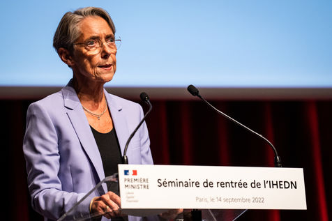Visite d'Elisabeth Borne, Premier ministre française, à l'occasion de la leçon inaugurale du séminaire de rentrée des auditeurs de l'Institut des Hautes Etudes de la Défense Nationale (IHEDN) à l'Ecole Militaire. Le Premier ministre prononce un discours devant les membres de la session nationale.