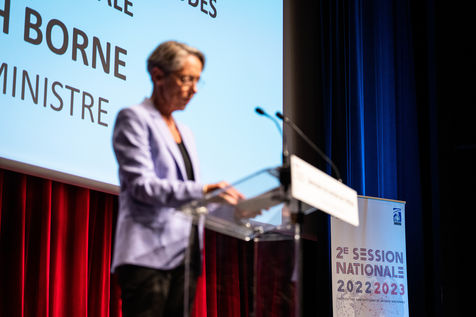 Visit of Elisabeth Borne, French Prime Minister, on the occasion of the inaugural lesson of the seminar of the Institut des Hautes Etudes de la Défense Nationale (IHEDN) at the Ecole Militaire. The Prime Minister delivers a speech to the members of the national session.