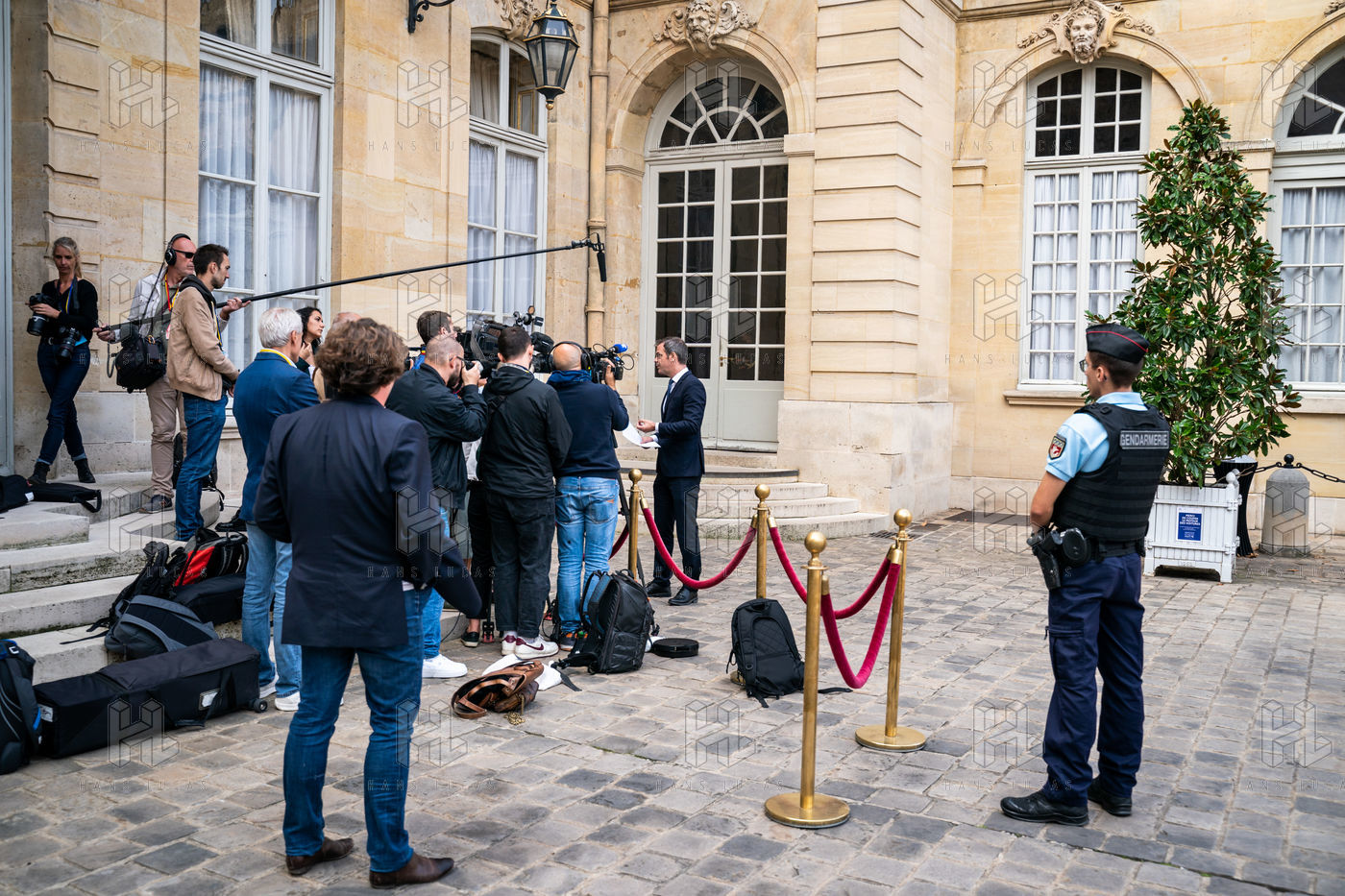 Déclaration à la presse d'Olivier Veran, ministre délégué auprès du Premier ministre, chargé du renouveau démocratique, porte-parole du gouvernement, dans la cour de l'hôtel de Matignon à l'issue de la réunion sur le CNR.