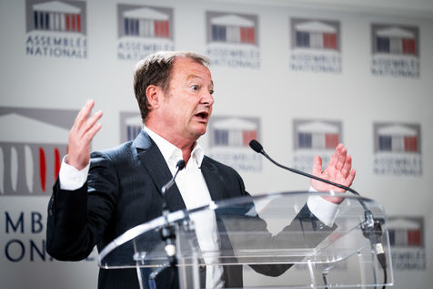 Présentation par Stéphane Peu, député de Seine Saint Denis du parti communiste, gauche démocratique et républicaine, GDR, membre du NUPES, de la proposition de loi relative à la réponse à la crise de recrutement des enseignants de l'Education Nationale, dans la salle de conférence de l'Assemblée Nationale.