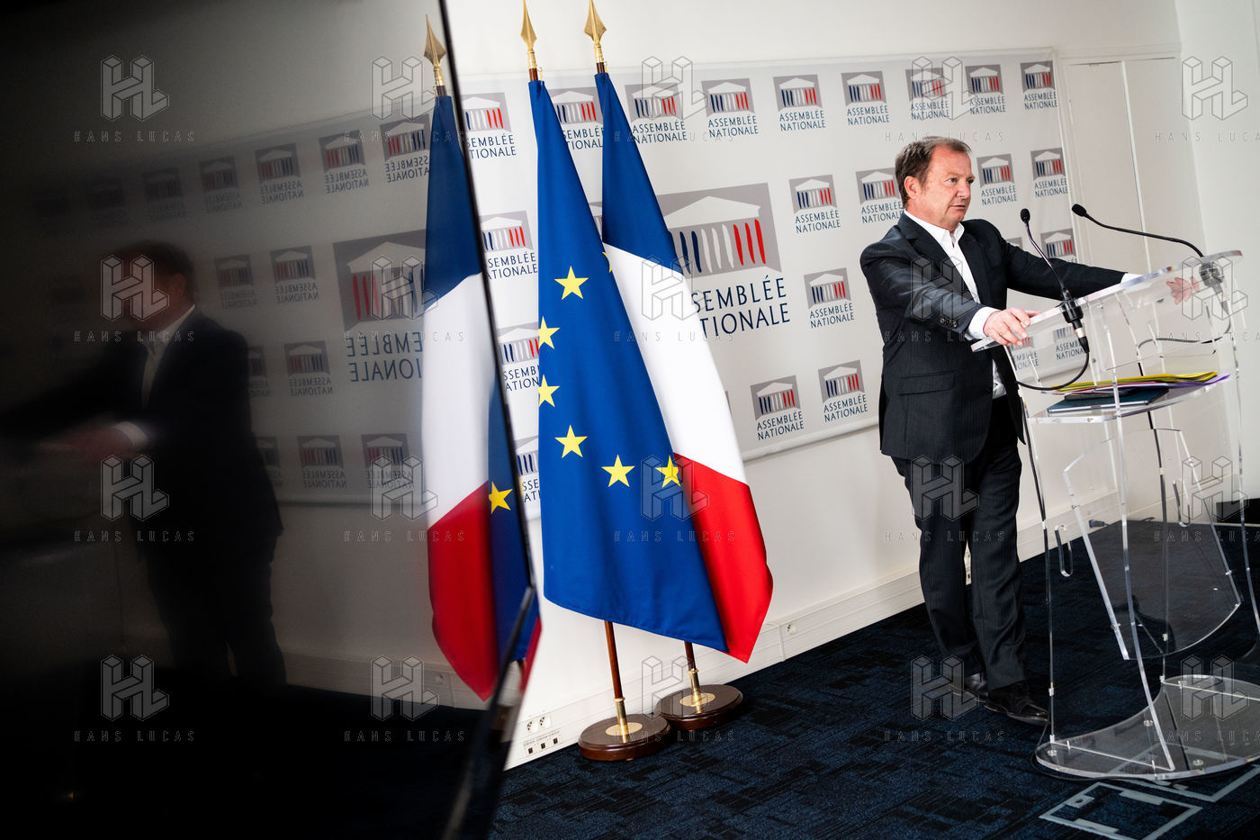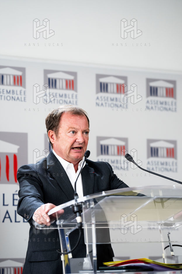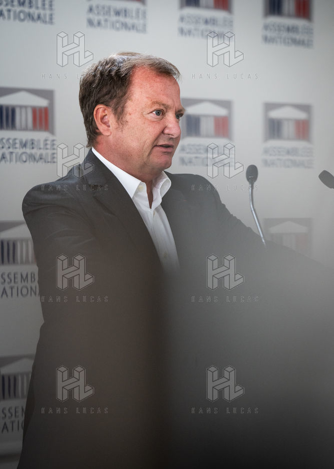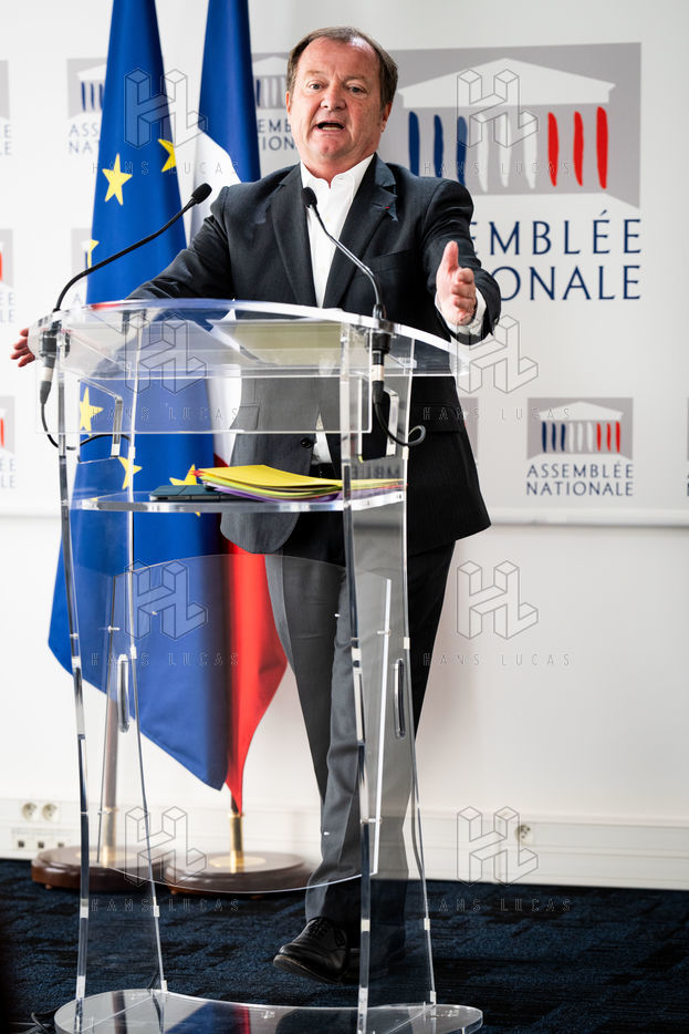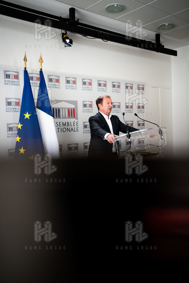 Presentation by Stéphane Peu, deputy of Seine Saint Denis of the communist party, democratic and republican left, GDR, member of the NUPES, of the bill relating to the answer to the crisis of recruitment of the teachers of the National Education, in the conference room of the National Assembly.