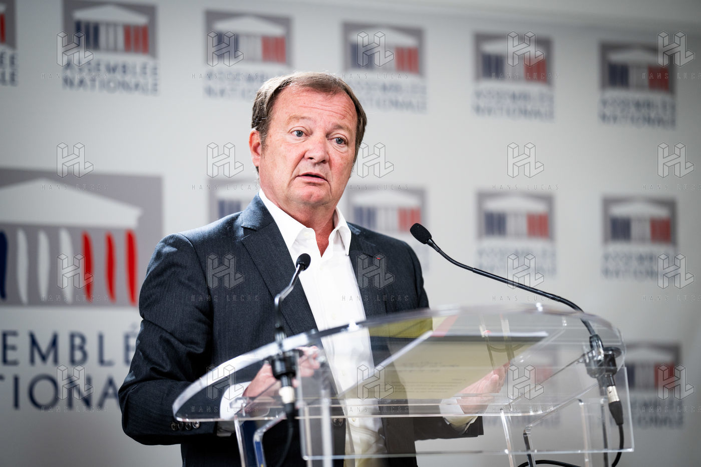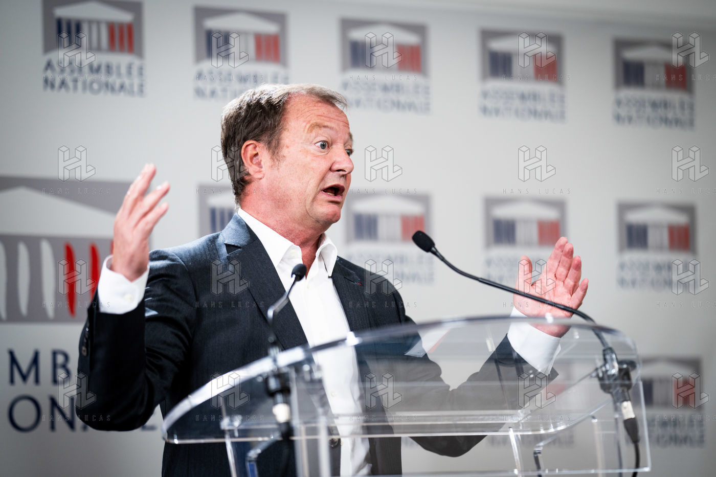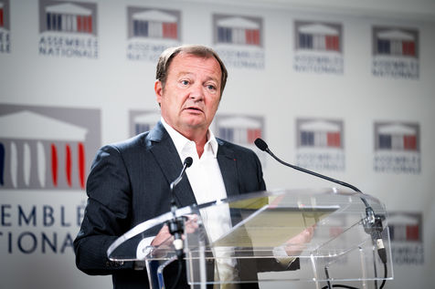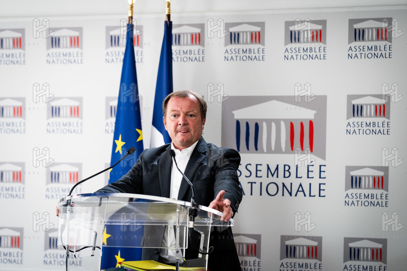 Presentation by Stéphane Peu, deputy of Seine Saint Denis of the communist party, democratic and republican left, GDR, member of the NUPES, of the bill relating to the answer to the crisis of recruitment of the teachers of the National Education, in the conference room of the National Assembly.