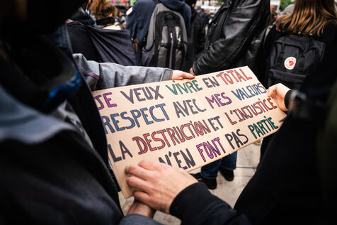Liquidation totale, tout doit disparaître à Paris. Rassemblement pour occuper les bureaux d'Amundi, premier gestionnaire d'actifs européen et quatrième actionnaire de TotalEnergies, à Paris.
