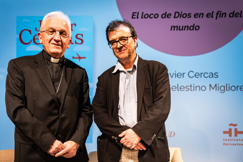 Meeting between the Apostolic Nuncio, Monsignor Celestino Migliore, and Javier Cercas, author of “The Madman of God at the End of the World” about Pope Francis, at the Cervantes Institute in Paris.