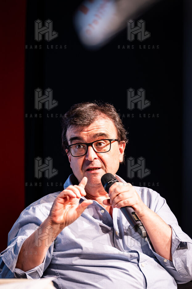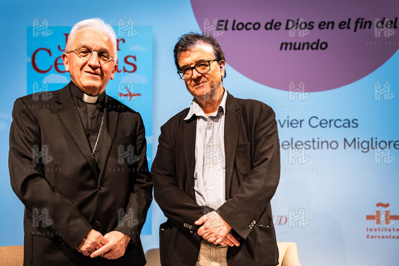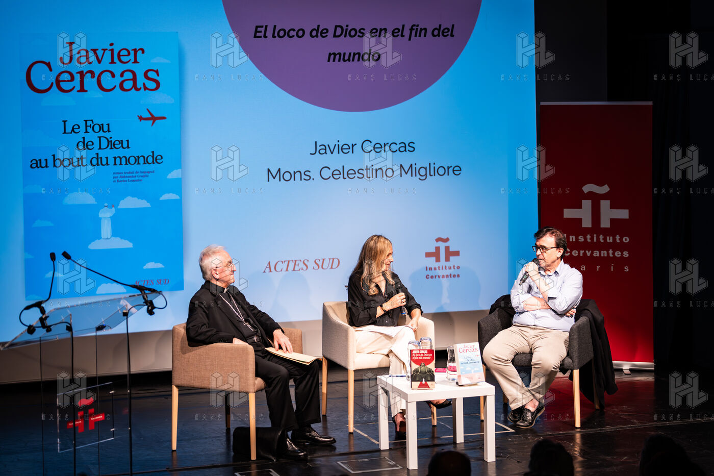 Rencontre entre le nonce apostolique, Monseñor Celestino Migliore et Javier Cercas, auteur du « Le fou de Dieu au bout du monde » sur le pape François, à l'institute Cervantes de Paris.