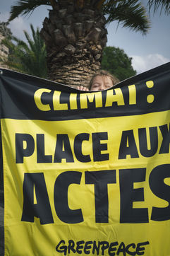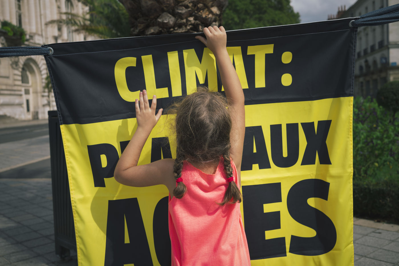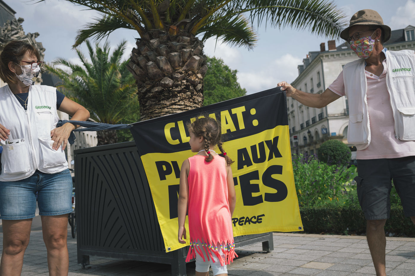 Tours, région centre, le 19 septembre 2020. Mobilisation pour le climat et la justice sociale. une fillette joue avec une banderole Greenpeace.
