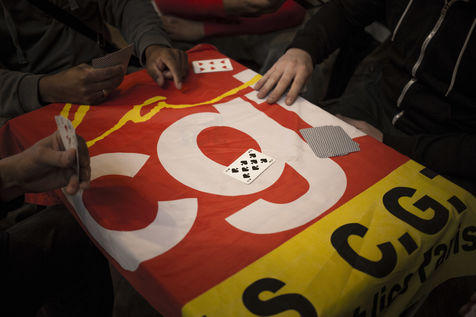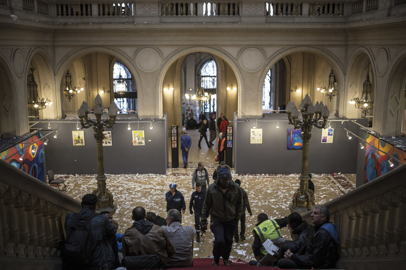 Paris, France le 8 octobre 2015. Des agent de la proprete de Paris occupe la mairie du 10eme apres leur 4eme jour de greve suite a une rupture de negociation sur des reformes de leur statut.
