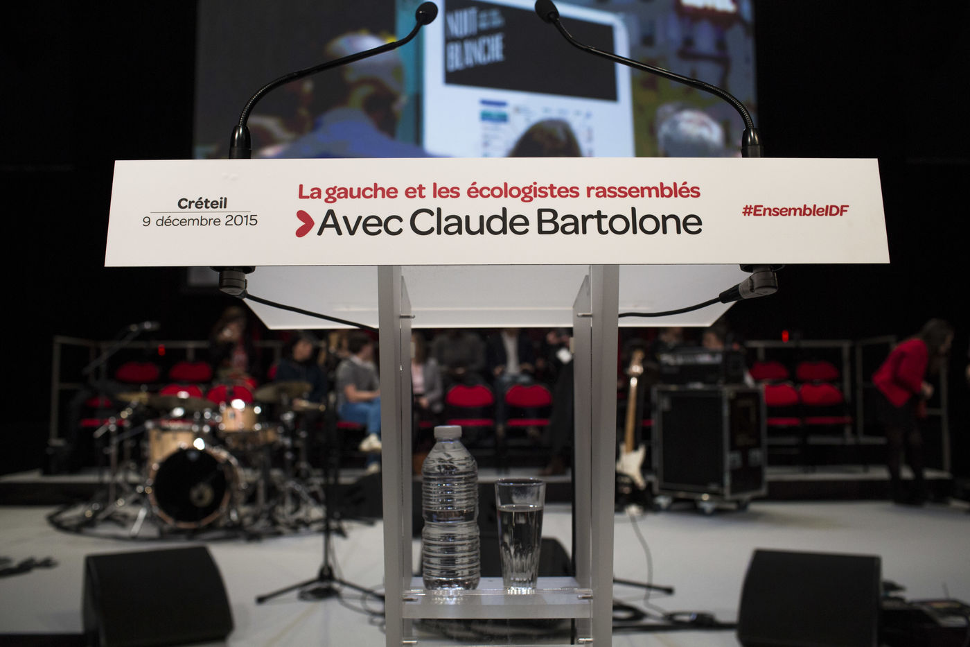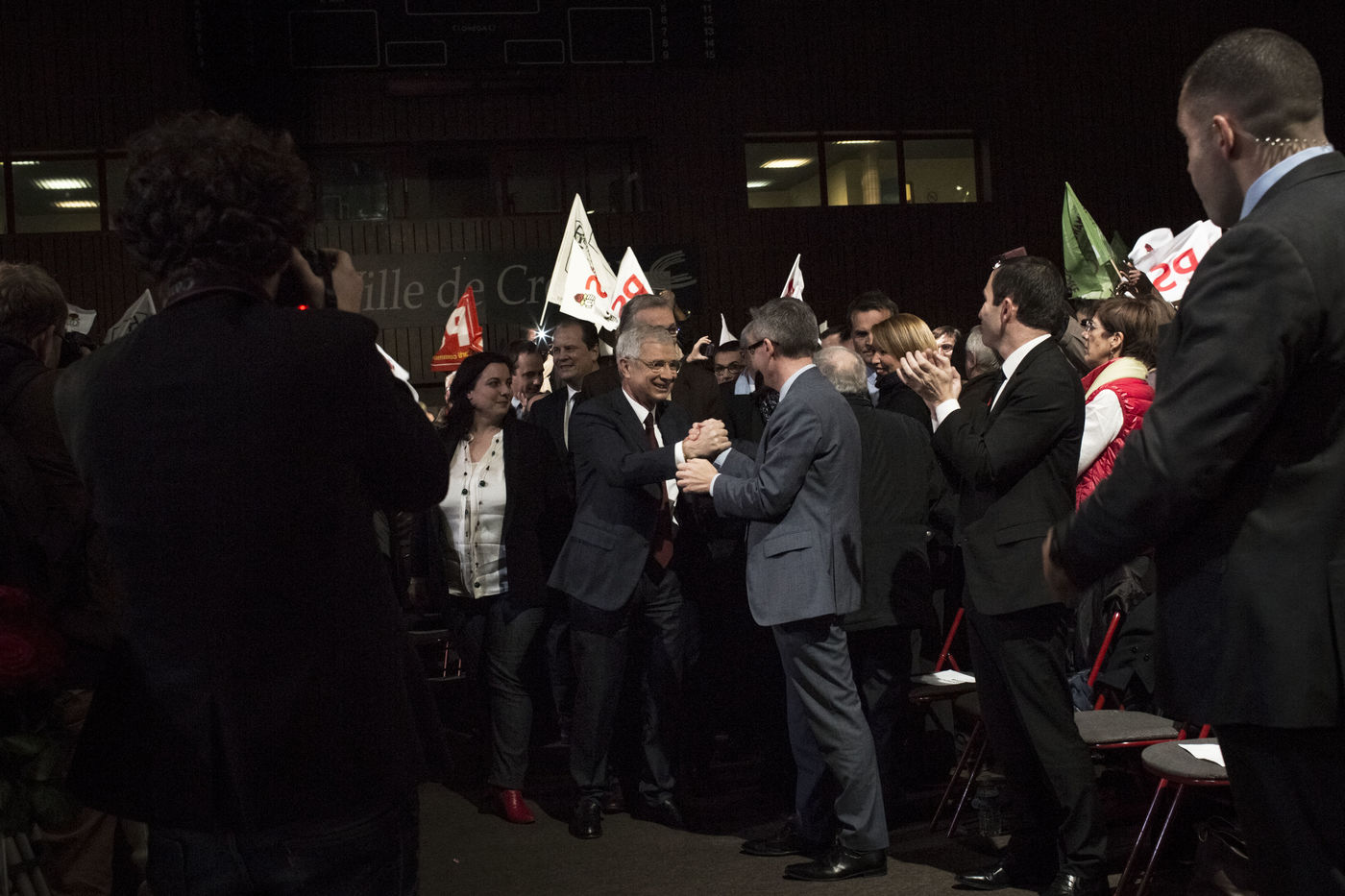 Creteil. France, le 09 décembre 2015. Meeting d'entre deux tours du rassemblement gauche et écologiste autour de la tête de liste pour l'Ile de France Claude Bartolone.