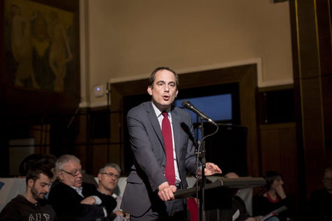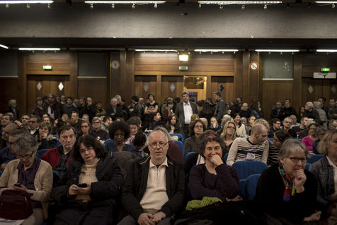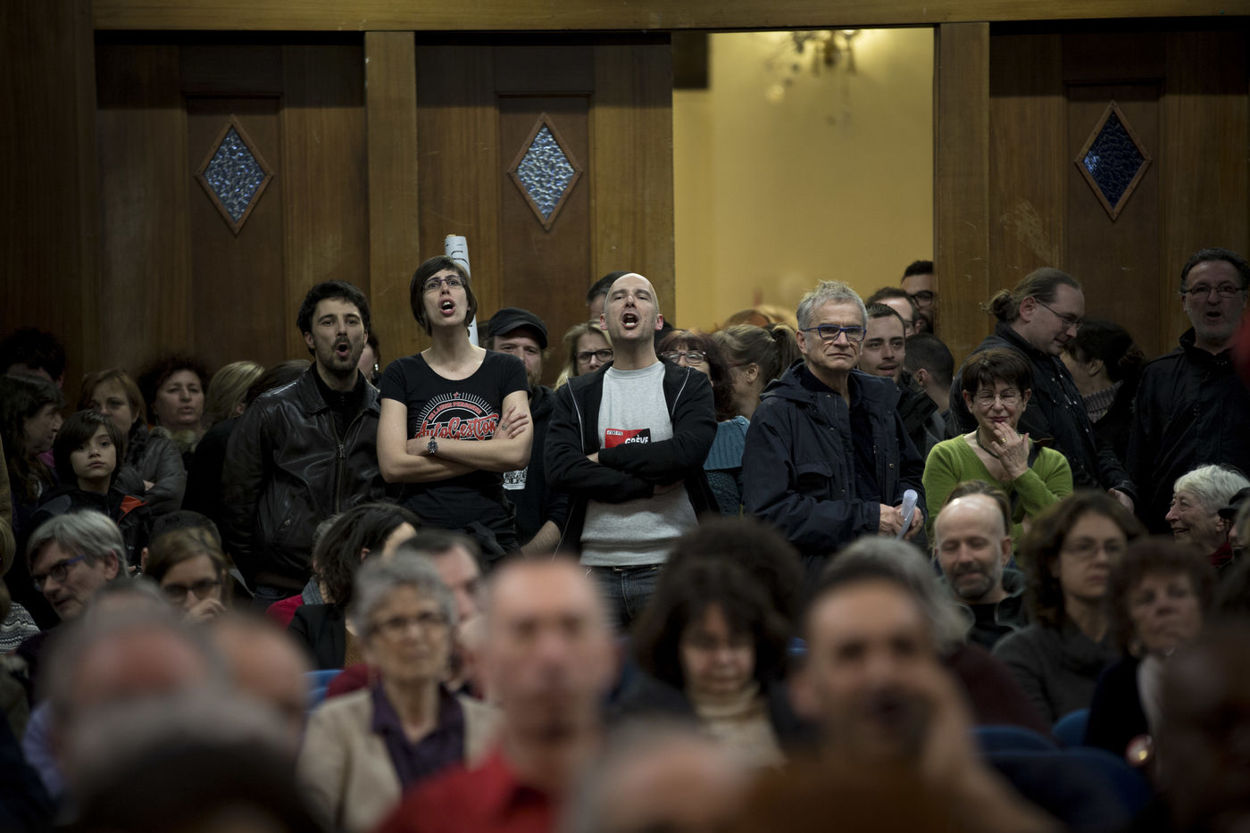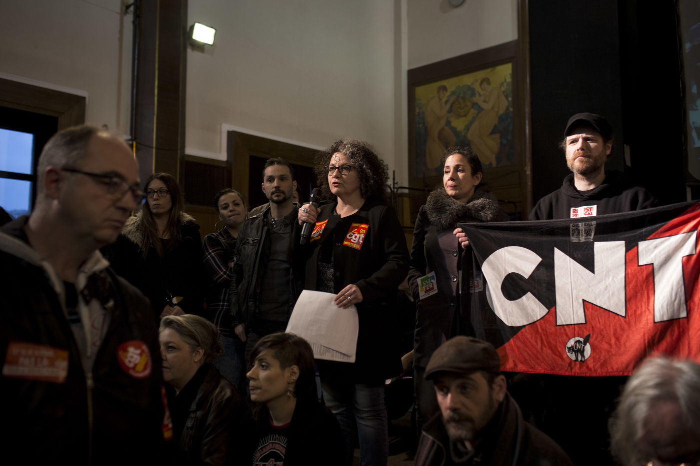 Montreuil. France. Le 23 mars 2016. Mairie de Montreuil. Meeting unitaire intersyndicale pour exiger le retrait du projet de loi El Khomri. A l initiative du Collectif le Code du travail Qu'il Faut Défendre (CQFD).