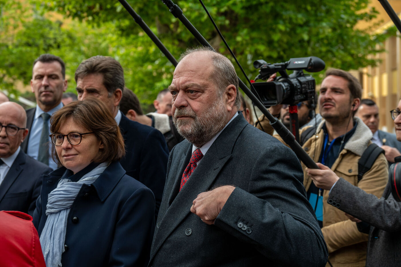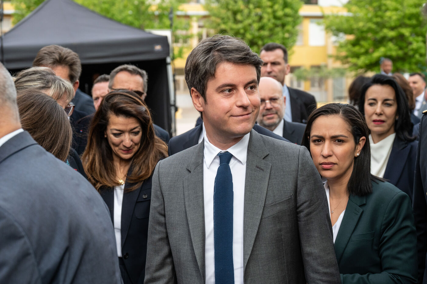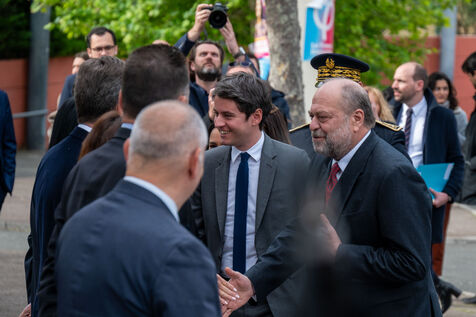 Gabriel Attal et Eric Dupont-Moretti en déplacement officiel pour le gouvernement français dans une école du centre de Nice, le 22 avril 2024. Le premier ministre et le ministre de la justice visitent un lycée du centre de Nice, et répondent aux questions des élèves, leurs familles et l'équipe pédagogique.