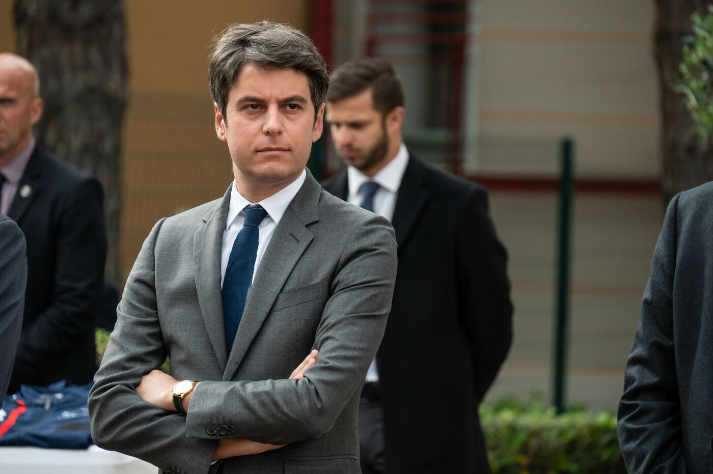 Gabriel Attal and Eric Dupont-Moretti on an official visit for the French government to a school in the centre of Nice on 22 April 2024. The Prime Minister and the Minister for Justice visit a secondary school in the centre of Nice, and answer questions from pupils, their families and the teaching staff.