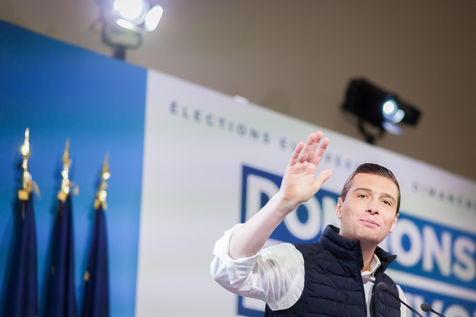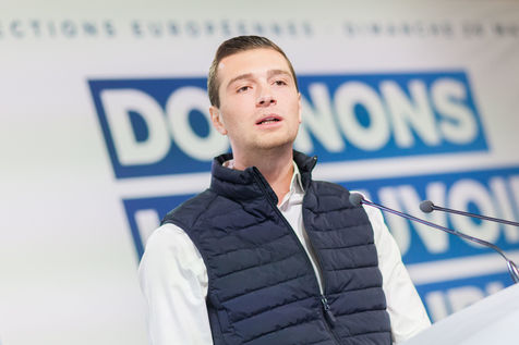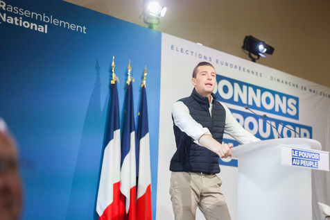 Meeting de Marine Le Pen accompagnée de la tête de liste du Rassemblement National pour les élections européennes Jordan Bardella à Chassors près de Jarnac en Charente, le 12 avril 2019 à Chassors, France.