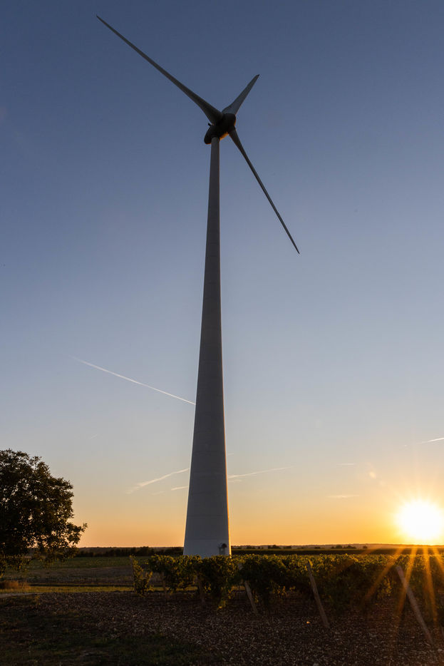 France, Saint-Fraigne, 2021.09.23. Parc éolien de Saint-Fraigne en Charente, en fin de journée.