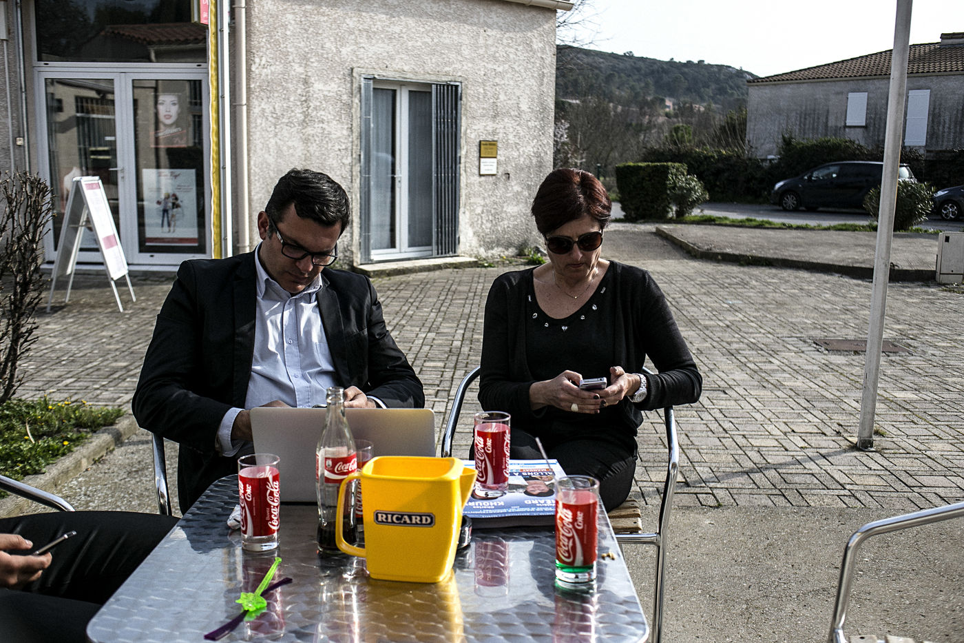 A quelques kilomètres de là, Agnès Gizard Carlin, candidate EELV dans le canton d'Agde, arrive dans le bar La Louisiane, où elle doit tenir une conférence de presse. Hasard, à la table d'à côté se trouve le candidat UDI Sébastien Frey. Seul. La candidate écolo, à l'accent du coin, glisse : « Dans cette campagne, je ne croise que les binômes homme dans les marchés. Je ne sais pas où sont les femmes ». Et d'évoquer son passage à Radio Pays de l'Hérault, où, lors du débat, « il n'y avait que deux candidates alors que les quatre candidats hommes étaient présents ». C'est un peu le combat de cette militante historique, héritière du militantisme de ses parents, qui étaient sur le plateau du Larzac. La veille encore, lors d'une visite au Planning familial, cette prof de SVT, croix occitane en pendentif, s'étonnait que ce soit « en majorité les femmes qui posent les questions sur la conciliation de la vie familiale et politique ».Une position soutenue par son colistier PCF, Frédéric Markidès. Bonhomme, il assure : « Je fais comme je peux, comme elle. Nous sommes deux couples de militants avec une journée de travail et un engagement politique à assurer ». La place des femmes dans cette campagne est un sujet qui a animé aussi les discussions entre militants. Au Parti socialiste, lors du meeting en présence de Benoît Hamon, les militants évoquaient pêle-mêle l'écoute, le sens des réalités ou la minimisation du combat des égos comme des qualités féminines. A cheval entre clichés et réalités, ces sujets sont tout autant revendiqués que dénoncés par les candidates.