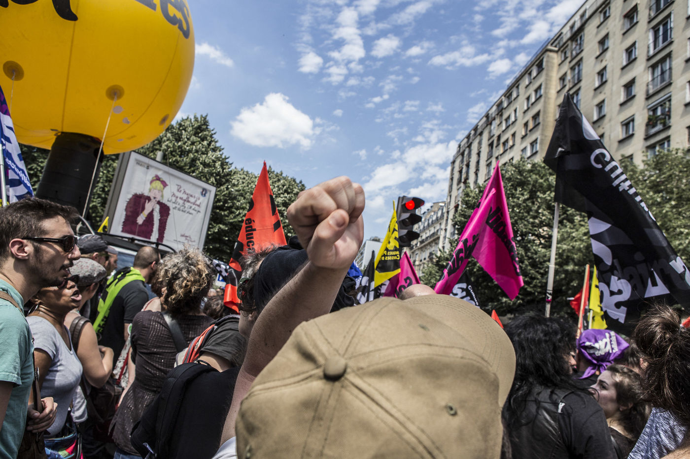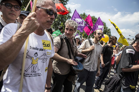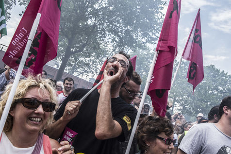23 juin 2016, Paris (75), France. Manifestation contre la loi El-khomri, dite loi travail. Après avoir interdit cette manifestation du fait des violences et destructions lors des manifestations précédentes, le gouvernement a autorisé ce cortège en imposant un parcours et un contrôle des manifestants.