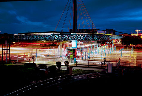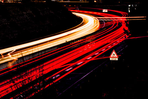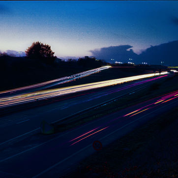 Automobiles et poid lourds, un flux incessant des machines traversant les abords de la ville. La lumière comme la marque indélébile de notre impact sur l'environnement. Les structures restent elles ici... Une marée rouge et blanche que l'on a du mal à voir éteinte.